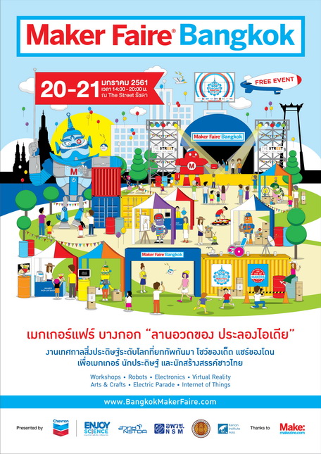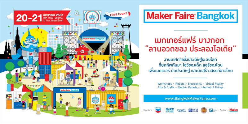 มหกรรม “Maker Faire Bangkok: ลานอวดของประลองไอเดีย” จะจัดขึ้นระหว่างวันที่ 20 – 21 มกราคม 2561 ตั้งแต่เวลา 14.00 – 20.00 น. ณ ลานหน้าศูนย์การค้า เดอะสตรีท รัชดา โดยเปิดให้ผู้สนใจเข้าร่วมกิจกรรมได้ฟรี พร้อมลุ้นรับของรางวัลมากมาย ติดตามรายละเอียดเพิ่มเติมได้ที่ www.BangkokMakerFaire.com