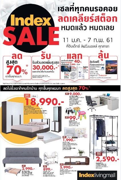 อินเด็กซ์ ลิฟวิ่งมอลล์ (Index Living Mall) ศูนย์รวมเฟอร์นิเจอร์และของแต่งบ้านอย่างครบวงจร ลดกระหน่ำรับปีใหม่ 2561 คืนกำไรให้ลูกค้า ด้วยแคมเปญ INDEX SALE มหกรรมลดราคาครั้งใหญ่ที่ทุกคนรอคอย เป็นการลดเคลียร์สต็อก!! หมดแล้ว หมดเลย!!!
