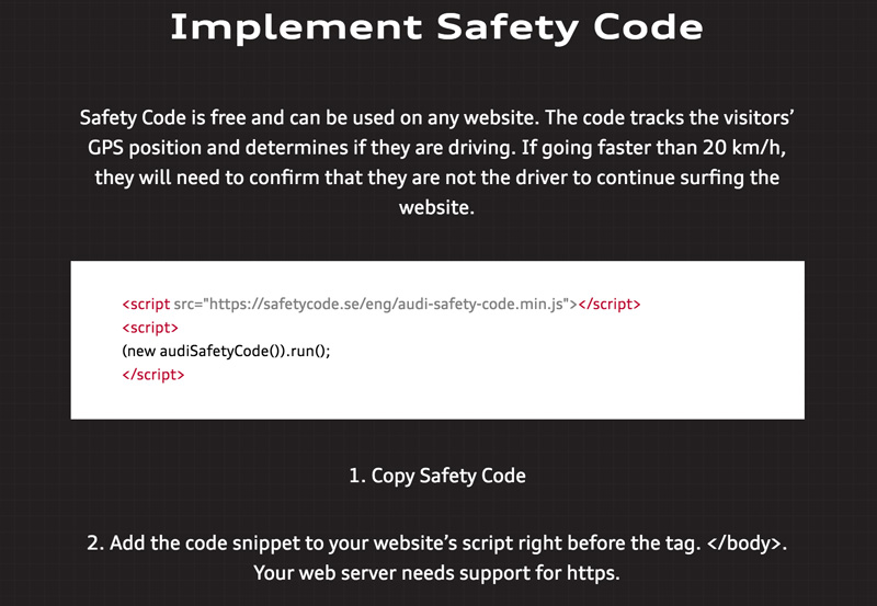 ผลงานนี้เป็นความคิดสร้างสรรค์จากเอเจนซี่ Åkestam Holst นอกจากจะทำให้กับรถยนต์ Audi แล้ว ในแคมเปญดังกล่าวยังแจกโค้ดซึ่งคำนวณความเร็วในการเคลื่อนที่ของดีไวซ์ถ้าหากว่าเกิน 20 กิโลเมตรต่อชั่วโมง ก็จะมีข้อความขึ้นถามก่อนว่าคุณเป็นคนขับรถหรือเปล่า (คล้ายๆ ข้อความที่จะขึ้นเตือนและถามในเกม Pokemon Go) ซึ่งเว็บไซต์อื่นๆ สามารถนำไปใช้ได้เลย ฟรี! พร้อมกันนี้ยังทำคอนเทนท์เพื่อให้ผู้บริโภคเข้าใจอันตรายของการใช้โทรศัพท์ขณะขับรถอีกด้วย