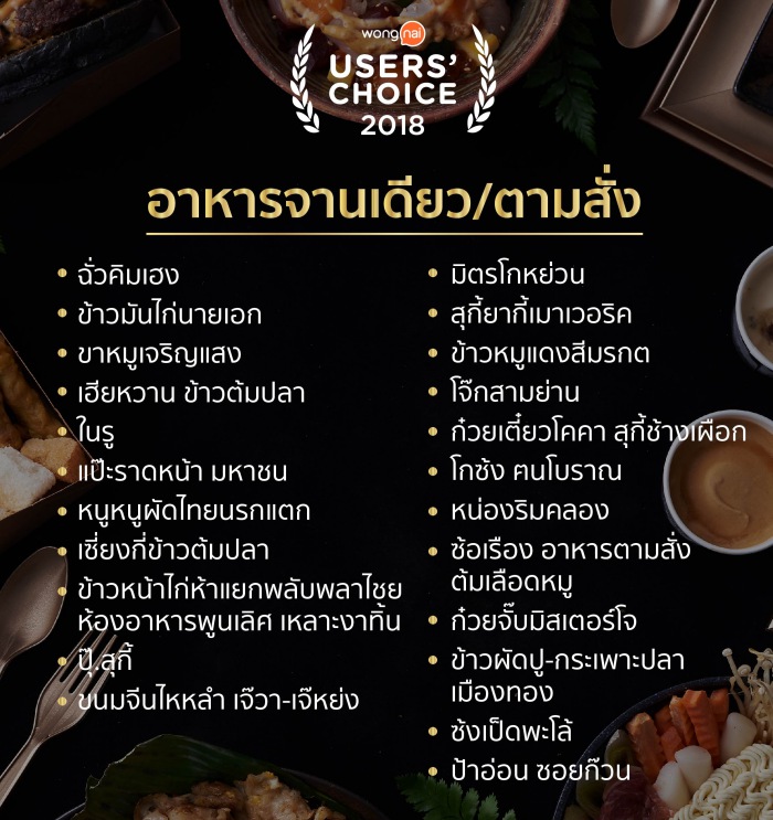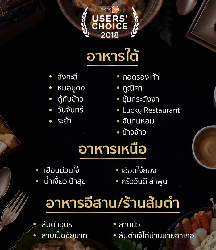 วงใน (Wongnai) เว็บไซต์ และแอปพลิเคชัน รีวิว แนะนำร้านอาหารอันดับ 1 ของเมืองไทยได้ประกาศรางวัลสุดยอดร้านอาหารยอดนิยมประจำปีสุดยิ่งใหญ่พร้อมกันกลางกรุง ภายใต้ชื่อรางวัล Wongnai Users’ Choice 2018 Sponsored By Mali ร้านยอดนิยมประจำปี ซึ่งมีจำนวนทั้งหมด 370 ร้าน โดยผ่านการคัดเลือกจากร้านอาหารทั่วประเทศกว่า 280,000 ร้านทั่วประเทศ ซึ่งใช้เกณฑ์การคัดเลือกด้วยจำนวนเรตติ้ง และรีวิวจากผู้ใช้วงในจำนวนกว่า 3,000,000 คน ทั่วประเทศในการตัดสิน โดยได้แบ่งออกเป็น 43 หมวดประเภทร้านอาหารดังต่อไปนี้