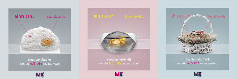 และ แคมเปญล่าสุด ME is MORE ที่สร้างกระแส #อย่ามาน้อย เพื่อปลุกกระแสให้ทุกคนหันมามองบัญชีเงินฝากตัวเองว่าคุณกำลังได้ดอกเบี้ยน้อยกว่าที่คุณควรจะได้หรือไม่ และการเปิดตัว ME BOT อัจฉริยะที่สามารถตอบคำถามลูกค้าเบื้องต้นได้แบบเรียลไทม์ตลอด 24 ชั่วโมง ผ่านช่องทาง Facebook Messenger เป็นครั้งแรกของวงการธนาคารไทยนี่เป็นเพียงแค่ส่วนหนึ่งของแคมเปญการตลาดที่ฉีกและสร้างความแตกต่างแบบสุดขั้วตามสไตล์ของ ME