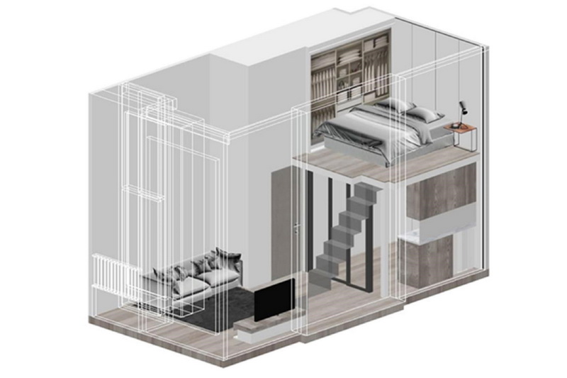 การออกแบบให้มีพื้นที่ใช้งานในห้องพักแบบ Duo Space ทั้งในระดับล่างที่เป็น Space ส่วนโถงทางเข้า ครัวและห้องน้ำ พื้นที่นั่งเล่น และพื้นที่วางเตียงนอน โดยที่ได้ พื้นที่เก็บของขนาดใหญ่ที่อยู่เหนือพื้นที่ห้องน้ำและครัว ในขณะเดียวกันก็สามารถปรับเปลี่ยน space การใช้งาน พื้นที่ด้านบนนี้ให้เป็น Space ส่วนนอนและ Walk in closet ผ่านการเชื่อมต่อได้ด้วยเฟอร์นิเจอร์ที่เป็นพื้นที่เก็บของ และเป็นเสมือนบันไดในตัว โดย Space บริเวณริมหน้าห้องต่างๆจะออกแบบเป็น Double Volume มีหน้าต่างกระจกสูงเพื่อเปิดมุมมองของ Space ภายในห้องพัก