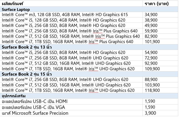 สำหรับรายละเอียดของ Surface Laptop, Surface Book 2 และอุปกรณ์เสริมที่จะวางจำหน่ายในประเทศไทย มีดังต่อไปนี้