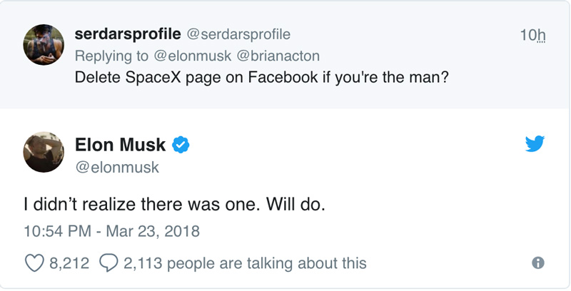 แอคเคานท์ของทั้ง 2 เพจ มีผู้ติดตามถึง 2.6 ล้านราย แต่ Elon ก็เลือกที่ลบแอคเคานท์ นอกจากนี้เมื่อมีคนถามเขาทางทวิตเตอร์เกี่ยวกับความเห็นในเรื่องนี้ เขารีทวีตกลับแบบสุดกวนว่า What’s Facebook?