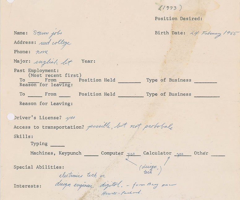 เขาเขียนชื่อของเขาว่า “Steven jobs” ใช้ j ด้วยตัวพิมพ์เล็ก เขาระบุที่อยู่เป็น “reed college” โรงเรียนที่ลาออก แทนที่จะเป็นที่อยู่อย่างเป็นทางการของตัวเอง ในส่วนของเบอร์โทรศัพท์ เขาเขียนว่า “none” ซึ่งเป็นเรื่องยาก ที่จะจินตนาการในยุคของ iPhone และถัดมาเรื่องการขนส่งและเดินทาง Jobs เขียนว่า “possible, but not probable.” (อันนี้ไม่รู้ว่ากวนหรือไม่สะดวกจริงๆ กันแน่)