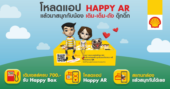 มากกว่านั้น… เมื่อแชร์ภาพหรือ VDO จากแอป Happy AR แล้วบอกเหตุผลว่าทำไหมถึงชอบน้องเติม น้องเต็ม หรือ เจ้าถัง พร้อมติด #ShellHappyBox ก็มีสิทธิ์ลุ้นรับบัตรเติมน้ำมันเชลล์ มูลค่า 500 บาท จำนวน 30 รางวัล ไปอย่างง่าย ๆ อีกด้วย!
