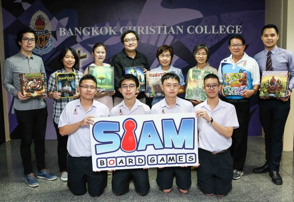บริษัท สยามบอร์ดเกม จำกัด ผู้นำแห่งวงการบอร์ดเกมในประเทศไทย มอบบอร์ดเกม สื่อสร้างสรรค์ทางความคิดเพื่อพัฒนาทักษะการเรียนรู้แนวใหม่ ให้แก่นักเรียนโรงเรียนกรุงเทพคริสเตียน เพื่อสนับสนุนให้นักเรียนได้ใช้เวลาว่างฝึกทักษะ ประลองความคิด และเสริมสร้างไหวพริบด้วยบอร์ดเกมแปลภาษาไทยลิขสิทธิ์แท้จากต่างประเทศ โดยมีอาจารย์วราภรณ์ ทรัพย์สมบูรณ์ (ยืนที่ 4 จากขวา) รองผู้อำนวยการฝ่ายวิชาการ อาจารย์กุลวิชญ์ ธนวลัญช์ (ยืนขวาสุด) กลุ่มสาระการเรียนรู้สังคมศึกษา ศาสนาและวัฒนธรรม และทีมผู้บริหารโรงเรียนกรุงเทพคริสเตียน เป็นผู้รับมอบ เมื่อเร็วๆ นี้