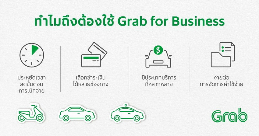 แกร็บ ได้ออกมาเขย่าวงการบริการรขนส่งอีกครั้งด้วยการแนะนำบริการ Grab for Business เพื่อมอบประสบการณ์การใช้บริการสำหรับลูกค้าองค์กรให้ง่ายดาย สะดวกสบาย และรวดเร็วยิ่งขึ้น โดยบริการดังกล่าวจะเป็นโซลูชั่นที่เข้ามาช่วยองค์กร ในเรื่องการจัดการค่าใช้จ่ายในการเดินทางให้กับพนักงาน ในกรณีที่พนักงานสามารถเบิกค่าเดินทางได้ เช่น จะต้องเดินทางออกไปประชุมข้างนอก ไปพบลูกค้า หรือรับส่งพัสดุเอกสาร เป็นต้น โดยทั้งหมดนี้จะช่วยเพิ่มประสิทธิภาพการทำงาน ลดขั้นตอนที่ยุ่งยากในการทำเรื่องเบิกจ่าย และเพิ่มความสามารถในการสร้างผลกกำไรขององค์กรอีกด้วย