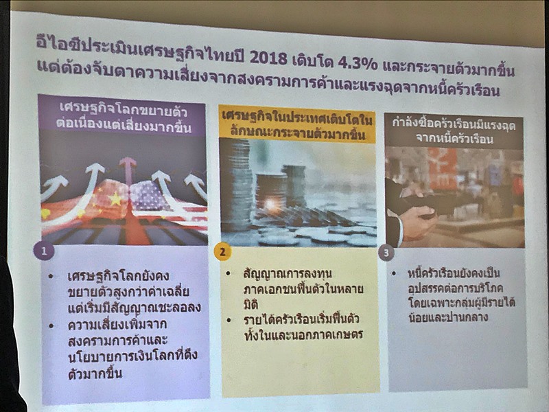 “อีไอซีเชื่อมั่นว่าเสถียรภาพของเศรษฐกิจไทยยังคงแข็งแกร่งและสามารถรองรับความผันผวนที่เกิดจากปัจจัยภายนอกได้ แม้ต้องเผชิญกับความผันผวนในตลาดเงินที่เพิ่มสูงมากขึ้นในช่วงที่ผ่านมา โดยเฉพาะในตลาดเกิดใหม่รวมถึงไทยจากผลกระทบของปัจจัยภายนอก ไม่ว่าจะเป็นนโยบายการเงินในประเทศเศรษฐกิจหลักที่ตึงตัวมากขึ้น การกลับมาแข็งค่าของสกุลเงินดอลลาร์สหรัฐฯ และความกังวลต่อความเสี่ยงสงครามการค้า แต่ปัจจัยพื้นฐานเศรษฐกิจไทยที่ยังคงแข็งแรง รวมทั้งสภาพคล่องในระบบการเงินที่มีเพียงพอ จะเป็นตัวกันชนที่ช่วยลดผลกระทบจากความผันผวนทางการเงินที่เกิดขึ้นต่อเศรษฐกิจไทยในช่วงครึ่งหลังของปี”