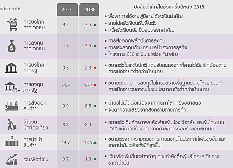 สำหรับการขยายตัวของเศรษฐกิจไทยในช่วงที่เหลือของปี 2018 อีไอซีคาดว่าภาคต่างประเทศจะยังคงเติบโตได้ต่อเนื่อง และยังเป็นแรงขับเคลื่อนสำคัญให้เกิดการลงทุนต่างๆ ทั้งจากภาคเอกชน รวมทั้งภาครัฐที่คาดว่าจะมีการลงทุนเพิ่มมากขึ้นในปีนี้ โดยคาดว่าจะขยายตัวเพิ่มขึ้น 11% จากปีก่อนที่ลดลง 1.2% จากผลกระทบต่อความล่าช้าของพรบ.จัดซื้อจัดจ้าง