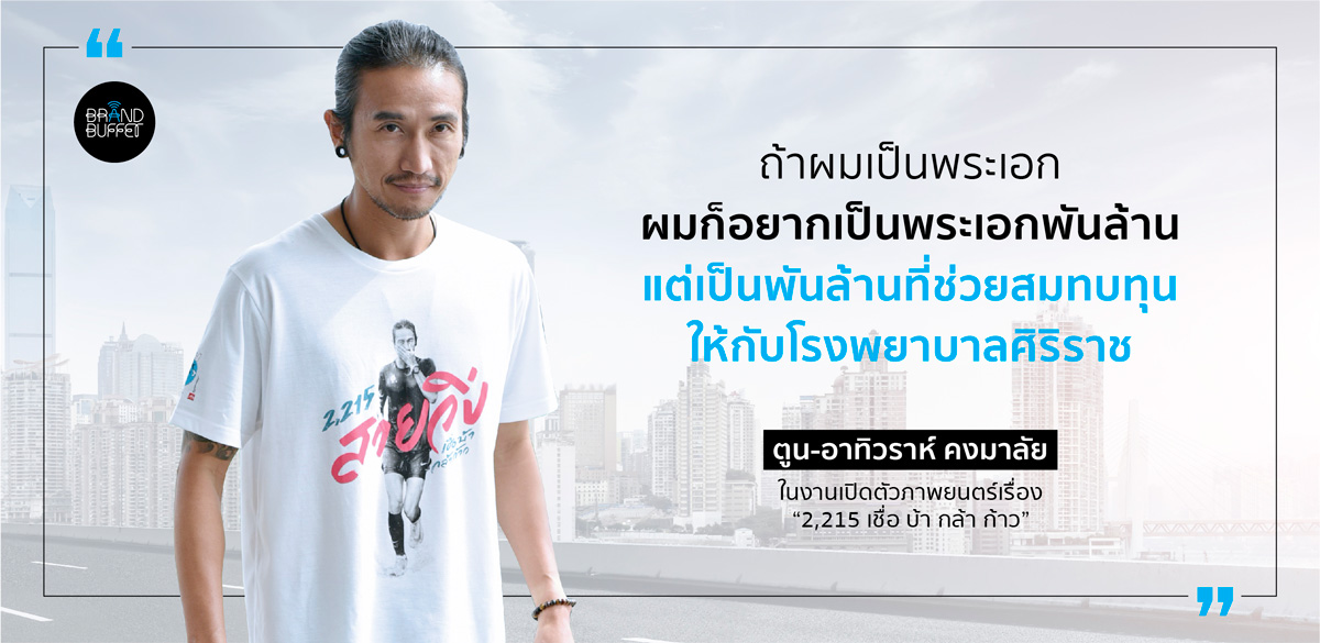 “มีคนชวนผมเล่นหนังหลายคนแล้ว ผมก็รออยู่  2 บท คือ บทก้อนหิน กับต้นไม้ ก็ไม่มีใครชวนผมไปเล่นสักที เรื่องนี้(“2,215 เชื่อ บ้า กล้า ก้าว”) ก็คงบอกได้ว่าผมเป็นพระเอก ถ้าผมเป็นพระเอก ผมก็อยากเป็นพระเอกพันล้าน แต่เป็นพันล้านที่ช่วยสมบททุนให้กับโรงพยาบาลศิริราช”  พี่ตูน-อาทิวราห์ คงมาลัย กล่าวในงานเปิดตัวภาพยนตร์เรื่อง “2,215 เชื่อ บ้า กล้า ก้าว”