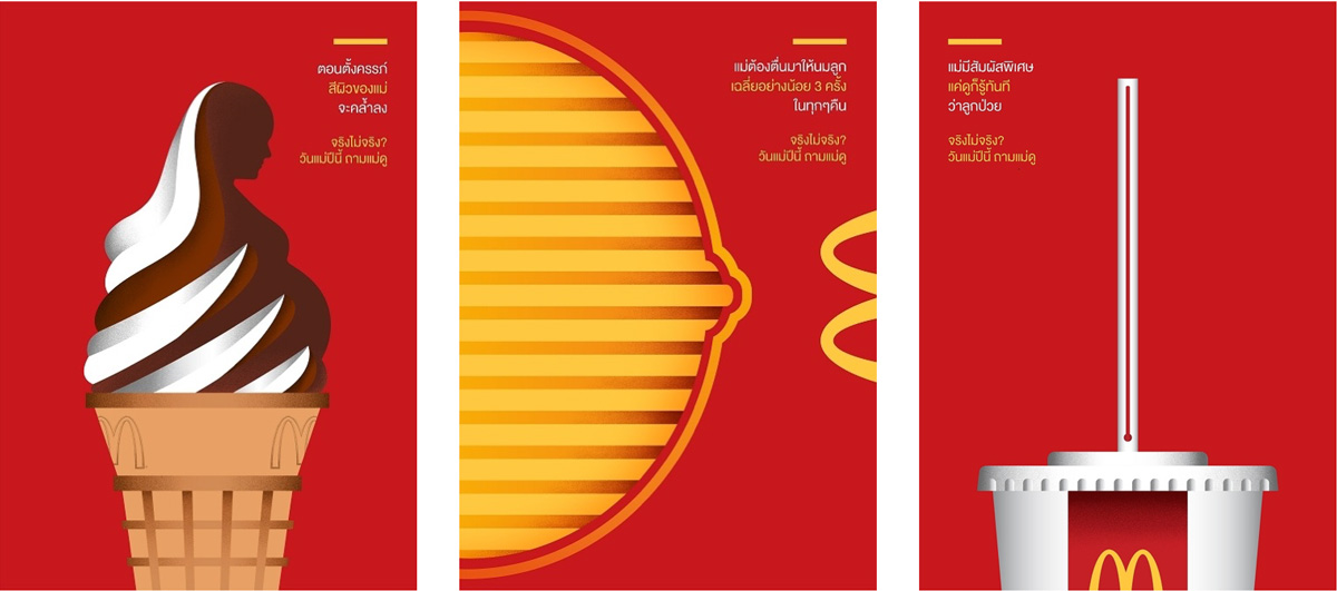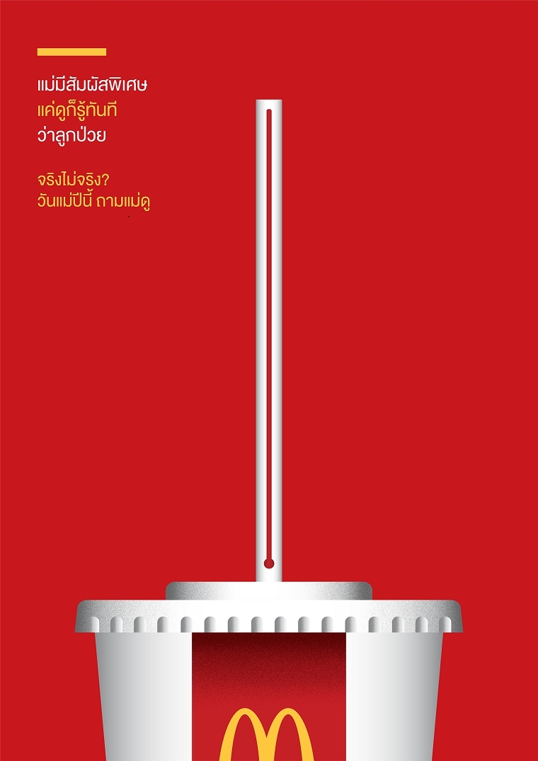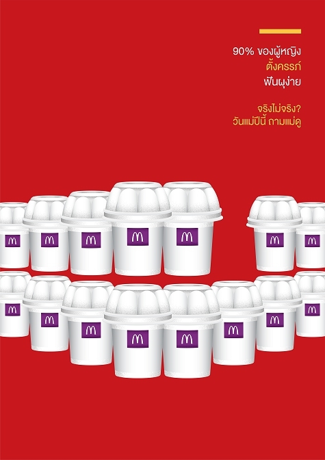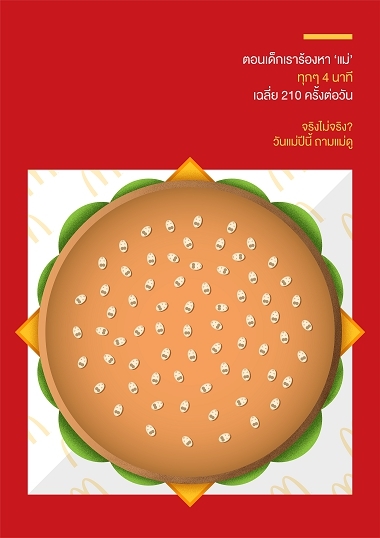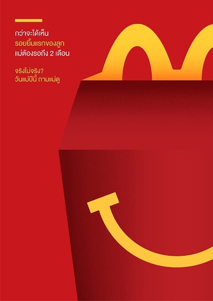 ‘วันแม่ปีนี้ … ลองถามแม่ดู’ (Ask Mom) เป็นแคมเปญที่สร้างสรรค์ผ่านงานดีไซน์ 9 คำถามจากเรื่องจริงของแม่ในรูปแบบโปสเตอร์ที่ออกแบบโดยการนำเมนูต่างๆ ของแมคโดนัลด์ ซึ่งเป็นผลงานการออกแบบสร้างสรรค์โดย TBWA \ THAILAND มาผสานกับเรื่องราวชวนซึ้งที่มีแต่แม่เท่านั้นที่ตอบได้ เพื่อเชิญชวนให้ลูกตั้งคำถาม และแม่เป็นผู้ถ่ายทอดเรื่องราวที่ลูกอาจไม่เคยรู้และแม่ไม่เคยเล่าให้ฟัง พร้อมกิจกรรมต่อเนื่อง ‘รับแอด … ให้แม่เลิฟ’ (You and Mom Are Now Friends) คือการตอบรับแม่เป็นเพื่อนในเฟสบุ๊ค จากเรื่องจริงที่พบในโลกโซเชียลมีเดียที่ว่า ลูกมักปฏิเสธที่จะตอบรับแม่เป็นเพื่อนในเฟสบุ๊ค ถึงแม้ว่าแม่พยายามจะใช้เทคโนโลยีเพื่อสร้างความใกล้ชิดกับลูกมากขึ้นเท่าไร ก็ยิ่งทำให้ลูกหนีห่างออกไปไกลทุกที กิจกรรมนี้จึงถูกสร้างสรรค์ขึ้นเพื่อปลุกความรู้สึกออกมาเป็นการกระทำพร้อมช่วยทลายกำแพงที่ขวางกั้นความสัมพันธ์ระหว่างแม่กับลูก เพราะหากมองในมุมกลับกันโลกโซเชียลมีเดียอาจเป็นพื้นที่แสดงออกในเรื่องยากที่จะสื่อสารเป็นคำพูด แมคโดนัลด์จึงขอเชิญชวนให้ลูกทุกคนได้ร่วมกันแสดงความรักและความห่วงใยต่อคุณแม่ผ่านโซเชียลมีเดียด้วยการตอบรับเป็นเพื่อนกับแม่ทางเฟซบุ๊ก