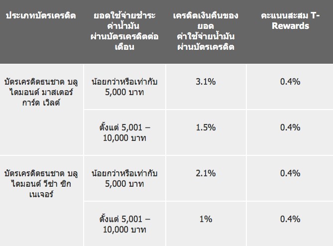 รับเครดิตเงินคืนเงิน (CashBack) เข้าบัญชีบัตรเครดิต จากการชำระค่าน้ำมันผ่านบัตรเครดิตธนชาต ณ สถานีบริการน้ำมัน ทุกปั๊ม ทุกที่ ทั่วโลก ภายใน 2 รอบบัญชี นับจากวันที่ทำรายการนั้นๆ โดยจะได้รับรายการคืนเงิน ดังนี้