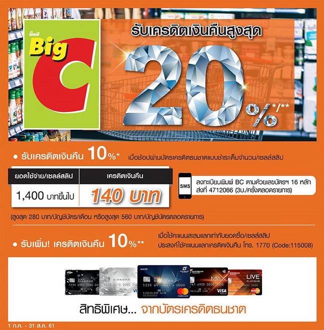 รับเครดิตเงินคืน 10% เมื่อช้อปผ่านบัตรเครดิตธนชาตแบบชำระเต็มจำนวน/เซลล์สลิป สามารถลงทะเบียนผ่านทาง SMS พิมพ์ BC ตามด้วยเลขบัตรฯ 16 หลัก ส่งมาที่ 4712966 (3 บาท/ครั้งตลอดรายการ)