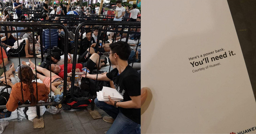 วันนี้ iPhone XS ที่สิงคโปร์เปิดจำหน่ายวันแรก และแน่นอนว่าก็มีลูกค้าไปต่อคิวซื้อ เพื่อที่จะจับจองเป็นเจ้าของกันตั้งแต่ล็อตแรก และแล้ว Huawei ก็ทำแสบอีกครั้งด้วยการสานสัมพันธ์กับลูกค้าของคู่แข่ง ด้วยการนำ Power Bank ของตัวเองไปแจกให้กับผู้บริโภคที่ต่อคิวอยู่ พร้อมทั้งข้อความจิกกัดสุดแสบ “You’ll need it” เพราะว่าคุณจะต้องใช้มัน แซวแรงเรื่องแบตเตอรี่ของ iPhone ที่มีความจุน้อยกว่าคู่แข่ง (ขณะที่ iPhone ก็มักจะบอกว่าไม่จำเป็นต้องมีแบตฯ เยอะเพราะระบบปฏิบัติการฉันดีย่ะ)