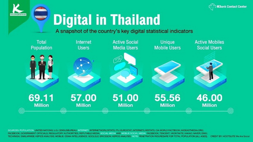 เห็นได้จากจากจำนวนประชากรไทยมีอยู่ที่ 69 ล้านคน มีผู้ใช้งานอินเทอร์เน็ตราว 57 ล้านราย ใช้งานโซเชียล มีเดียเป็นประจำราว 51 ล้านราย มีกลุ่มผู้ใช้งานผ่านโมบายล์ ราว 55 ล้านราย และใช้งานผ่านโมบายล์ โซเชียล 46 ล้านราย