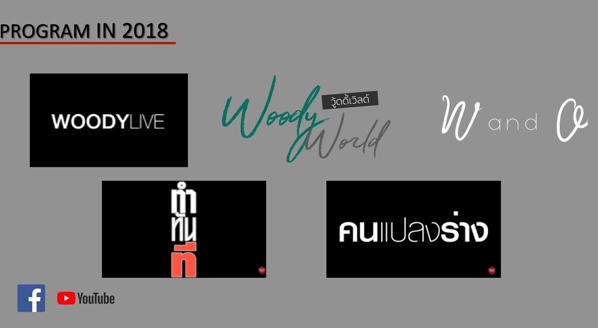 4. ในส่วนของโปรแกรมคอนเทนต์ต่างๆ จะมีการปรับเพื่อให้สอดคล้องกับพฤติกรรมและความสนใจของผู้ชมมากขึ้น เช่น การออกอากาศ Woody Live ที่จะทำอย่างเข้มข้นขึ้น และเปลี่ยนจากการออกอากาศทุกวันมาเป็นเดือนละครั้ง โดยเลือกหัวข้อคอนเทนต์หรือคนที่จะคุยด้วยที่สามารถสร้าง Talk of The Town ทั้งในระดับประเทศหรือระดับโลก เพื่อรักษา Engagement Rate ที่มีต่อคอนเทนต์ เพราะการมีรายการทุกวันทำให้ยอดผู้ชมลดลงจากที่เคยทำได้หลัก 2-3 แสนวิว แต่ในบางเทปยอดผู้ชมลดเหลืออยู่เพียงแค่ 800 วิวเท่านั้น
