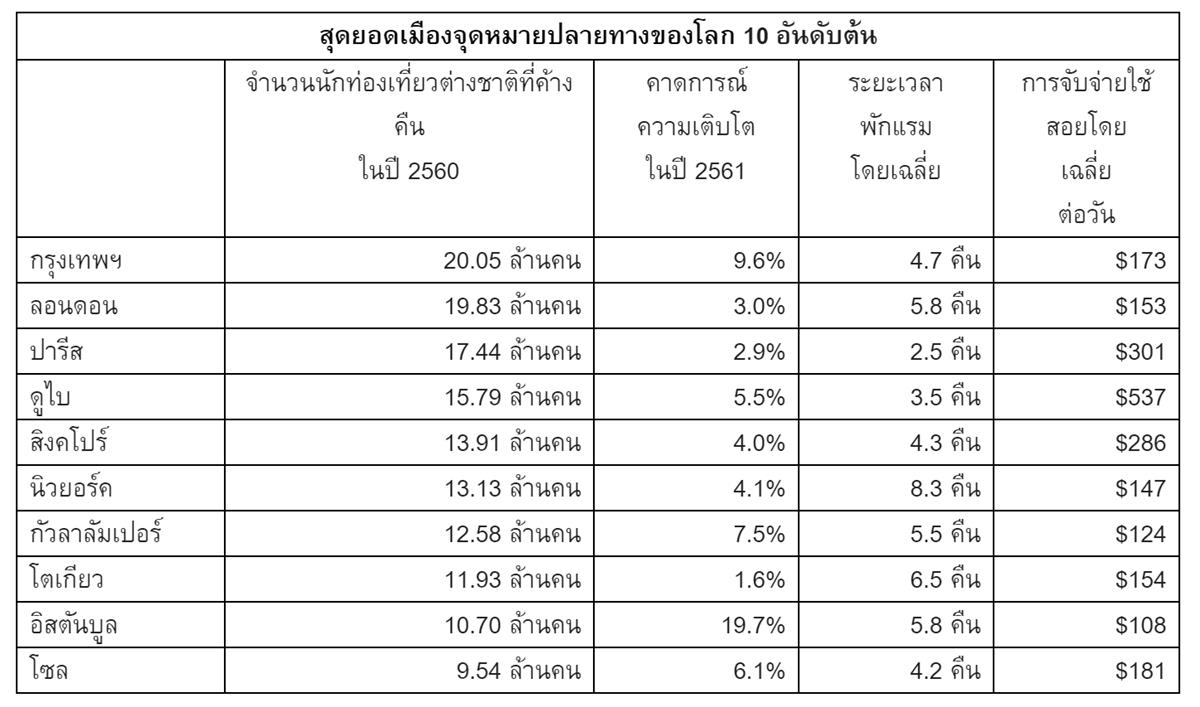 ตามผลสำรวจ กรุงเทพฯ คือสุดยอดเมืองที่เป็นจุดหมายปลายทางอันดับหนึ่งของโลกที่นักท่องเที่ยวต้องการมาเยือนและพักแรมมากที่สุด นับเป็นการครองอันดับ 1 เป็นครั้งที่ 5 ในรอบหกปี (นับจากปี 2555) และเป็นการครองตำแหน่งต่อเนื่องมาเป็นปีที่ 3 ติดต่อกัน ที่สำคัญในปีนี้ยังมีภูเก็ตและพัทยาติดโผเข้ามาอยู่ใน 20 อันดับแรกด้วย โดยภูเก็ตอยู่ในอันดับที่ 12 และพัทยาอยู่ในอันดับที่ 18