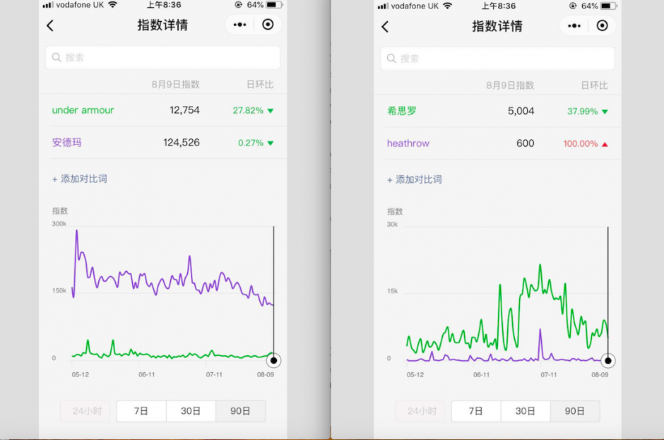 จากภาพเป็นตัวอย่างการค้นหาของแบรนด์กีฬา Under Armour และ Wechat Heathrow ชื่ออังกฤษของ Under Armour มีเพียง 1/10 ที่ได้รับความนิยมการค้นหาเมื่อเทียบกับชื่อภาษาจีน安德玛 (ออกเสียงว่า An-de-ma) ด้านขวาคือผลลัพธ์ของ WeChat ของลูกค้า Heathrow ของเรา ความแตกต่างในอัตราการค้นหาและการถูกกล่าวถึงจะคล้ายกับ Under Amour