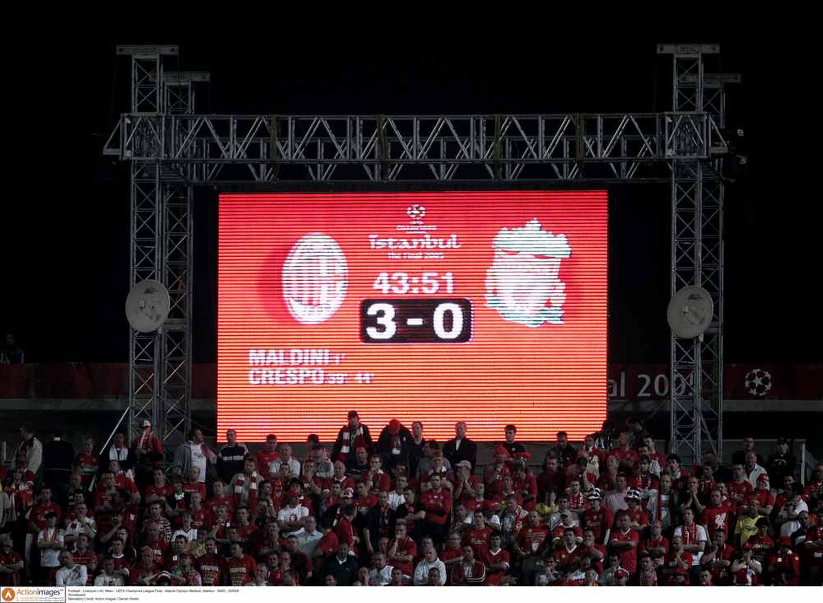 หลังจบครึ่งแรกบนสกอร์บอร์ดปรากฏภาพชัดเจนว่า มิลานนำลิเวอร์พูลอยู่ 3-0
