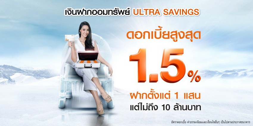 เงินฝากออมทรัพย์ ULTRA SAVINGS ถือเป็นเงินฝากดอกเบี้ยสูง เพราะมีลักษณะเด่นในแง่ที่เป็นบัญชี ฝากถอนแบบออมทรัพย์รับดอกเบี้ยสูงแบบประจำ ทั้งยังมีสภาพคล่องสูงกว่าบัญชีเงินฝากประจำ ให้เบิกถอนได้ โดย คิดดอกเบี้ยทุกวันรับดอกเบี้ยทุกเดือน รับดอกเบี้ยสูงสุด 1.5 % ต่อปี สำหรับวงเงินฝากตั้งแต่ 100,000 แต่ไม่ถึง 10,000,000 บาท