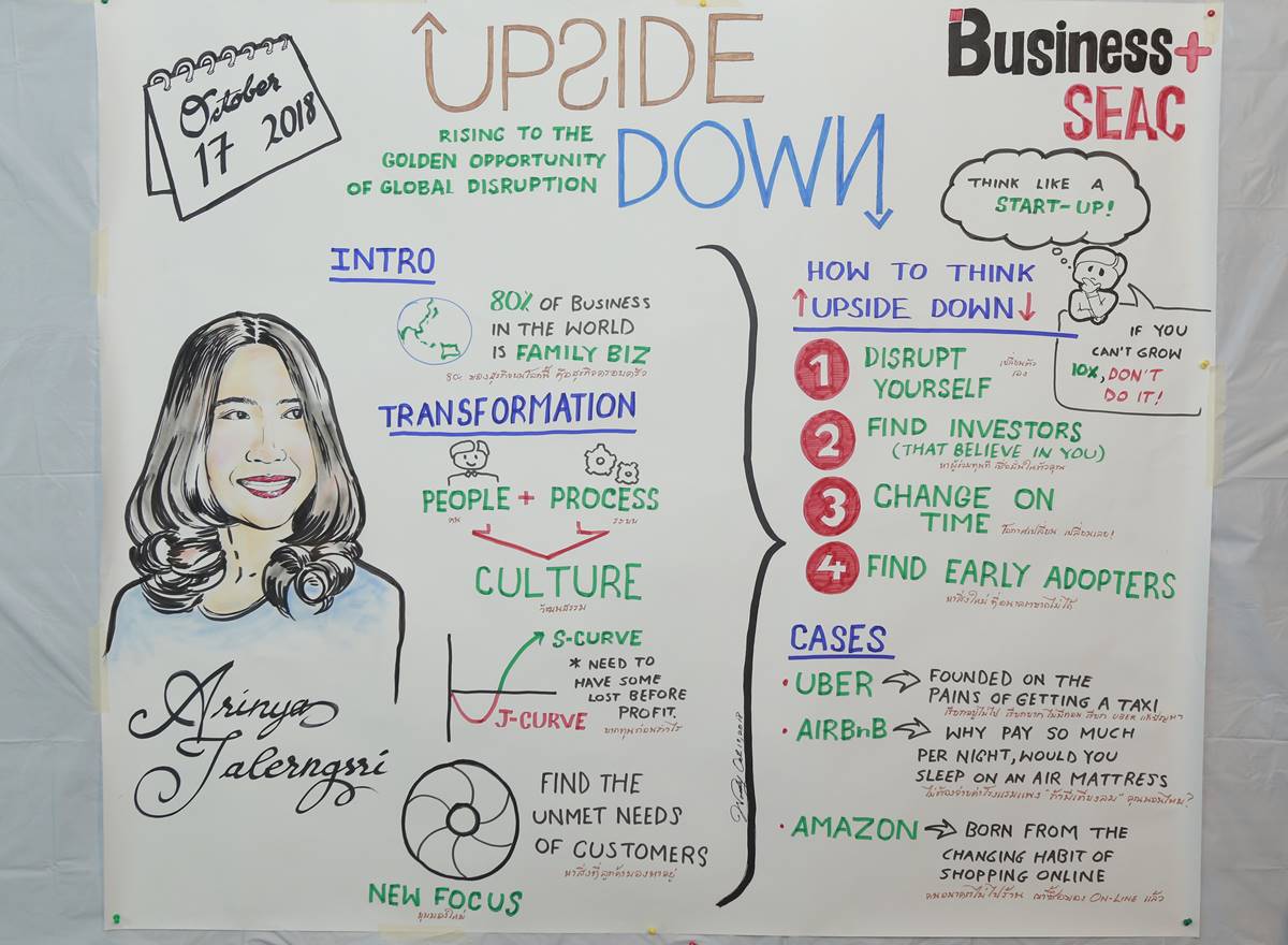ด้าน คุณอริญญา เถลิงศรี กรรมการผู้จัดการ ศูนย์พัฒนาภาวะผู้นำและผู้บริหารระดับสูง SEAC (South East Asia Center) นำเสนอวิธีให้ธุรกิจครอบครัวรอดพ้นจากการถูก Digital Disruption ซึ่งเป็นอีกหนึ่งปัญหาสำคัญที่กลุ่ม Family Business มีความกังวลอยู่ จำเป็นต้องปรับเปลี่ยนวิธีคิดในการดำเนินธุกิจ และสามารถตอบโจทย์ความต้องการของผู้บริโภคในปัจจุบันผ่านมุมมองในการทำธุรกิจแบบ Upside Down Thinking ซึ่งเป็นหนทางที่จะทำให้ธุรกิจครอบครัวในปัจจุบันสามารถรอดพ้นจากความท้าทายต่างๆ ที่มีรอบด้าน รวมทั้งเป็นโอกาสในการสร้างการเติบโตใหม่ๆ ให้แก่ธุรกิจจากที่เคยโตต่อเนื่องตามปกติ มาเป็นการเติบโตได้อย่างก้าวกระโดดเป็นหลายๆ เท่าตัว โดยวิธีคิดต่างๆ ประกอบด้วย
