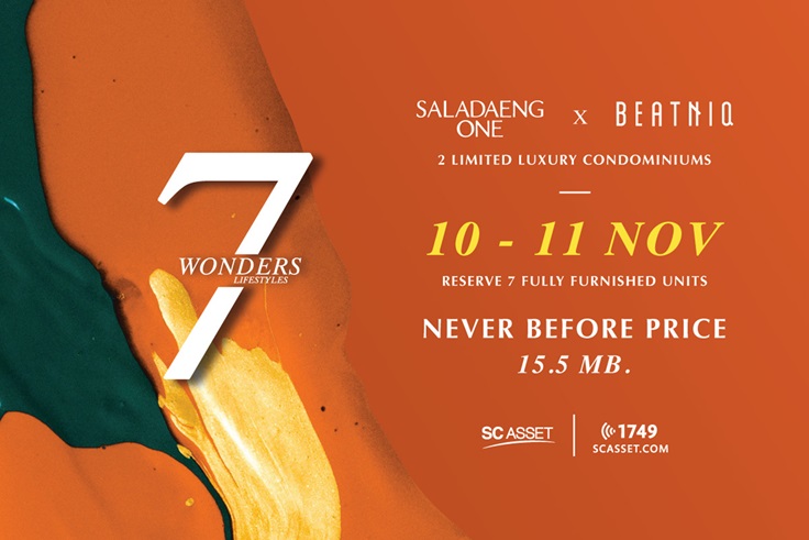 บริษัท เอสซี แอสเสท คอร์ปอเรชั่น จำกัด (มหาชน) เปิดประสบการณ์ที่แตกต่างด้วยห้อง 7 แบบ ภายใต้แคมเปญ “ 7 WONDERS 7 LIFESTYLES” ที่ออกแบบตกแต่งด้วยดีไซน์เนอร์ทั้ง 7 ห้อง ในสไตล์แตกต่างกัน เพื่อ 7 Lifestyles ที่สะท้อนตัวตนลูกค้าแต่ละแบบ ด้วยขนาดห้องแบบ 1 ห้องนอน กว้าง 57 ตรม. พร้อม Branded Furniture นำเข้า อาทิ Less is more , Bolier , Bernhardt , Wendelbo, Arper, Glas Italia ฯลฯ ในราคาสุดพิเศษ เริ่มต้น 15.5 ล้านบาท กับ 2 โครงการ Limited Luxury Condominiums ที่สร้างเสร็จพร้อมเข้าอยู่ ได้แก่ โครงการ SALADAENG ONE (ศาลาแดง วัน) และ BEATNIQ (บีทนิค)
