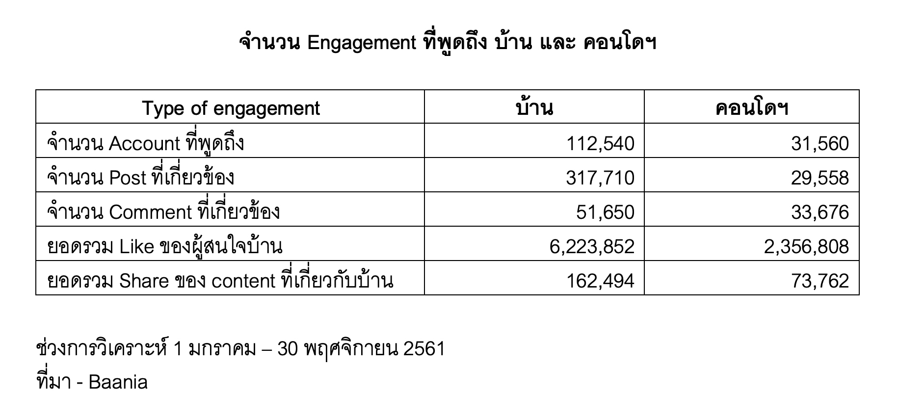 มาดูกันว่าช่วง มกราคม-พฤศจิกายน 2561 ที่ผ่านมาคนในโลกโซเชียล มีเดีย มีประเด็นการพูดถึงในอสังหาฯ อย่างไรบ้าง สำหรับ Topic of The Year เกี่ยวกับเรื่องบ้าน ข้อความถูกพูดถึงมากที่สุด อันดับ 1 คือ ความสนใจบ้านย่านสุขุมวิท 13.53% อันดับ 2 คือ เว็บไซต์ Baania 6.05% อันดับ 3 พูดถึงโครงการแสนสิริ 5.94% อันดับ 4 ให้ความสนใจบ้านย่าน สาทร อโศก รัชดาฯ และลาดพร้าว 77% และอันดับ 5 ให้ความสนใจโฮมออฟฟิศในย่านรังสิต เพชรเกษม และรามอินทรา 5.54%