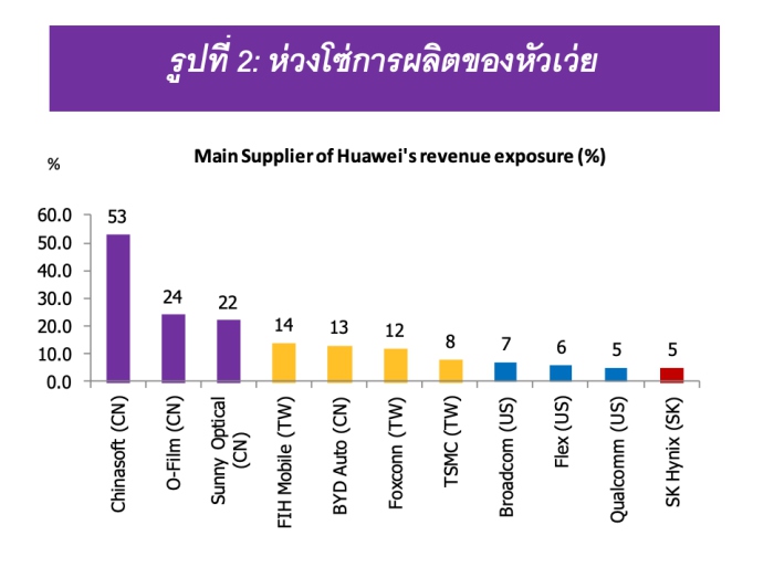 ในการผลิตโทรศัพท์มือถือ (Smart Phone) นั้น หัวเว่ยต้องใช้ Chips ที่ผลิตจากบริษัทสหรัฐ เช่น Intel และ NXP รวมถึงจากประเทศที่เป็นพันธมิตรด้านความมั่นคง เช่น อังกฤษ ญี่ปุ่น ไต้หวัน เกาหลีใต้ เป็นต้น ซึ่งหากประเทศเหล่านี้ประกาศคว่ำบาตรหัวเว่ย อาจทำให้บริษัทที่เคยเป็น Supplier สำคัญของหัวเว่ย เช่น ASE, LG Display, Sunny Optical, TSMC และ Qualcomm จำเป็นต้องหยุดทำธุรกรรมกับหัวเว่ย ซึ่งจะทำให้บริษัทที่เป็นลูกค้าสำคัญของหัวเว่ยและต้องพึ่งพาหัวเว่ยในการเป็นห่วงโซ่การผลิต เช่น Chinasoft, BYD Auto, Foxconn, TSMC และ SK Hynix ประสบปัญหาขาดชิ้นส่วนในการผลิตสินค้า (รูปที่ 2)