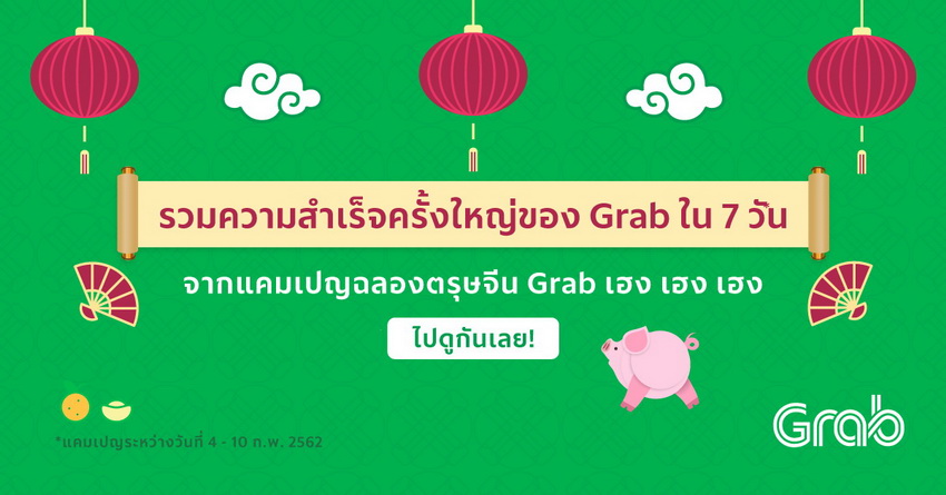 จากตัวเลขดาวน์โหลดกว่า 136 ล้านครั้งในภูมิภาคและหลายล้านผู้ใช้ในประเทศไทย แกร็บ ได้รับเสียงตอบรับที่ดียิ่งขึ้นเรื่อยๆ เสมอมาทั้งจากพันธมิตรชั้นนำและผู้ใช้ อาทิ ความสำเร็จล่าสุดในแคมเปญใหญ่อลังการรับตรุษจีน “แกร็บ เฮง เฮง เฮง แจกทีกว่า 100 ล้าน” ช่วงวันที่ 4 – 10 กุมภาพันธ์ 2562 ซึ่งมีผู้ใช้งานและผู้ประกอบการร่วมกิจกรรมมากกว่า 3 ล้านรายในช่วงระยะเวลาแคมเปญเพียง 7 วัน และมีข้อมูลน่าสนใจตามแผนภาพนี้