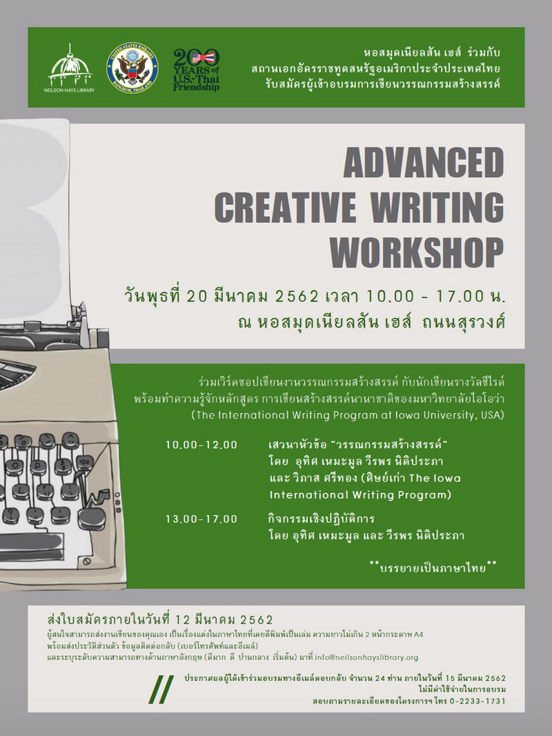 “หอสมุดเนียลสัน เฮส์” ร่วมกับ “สถานเอกอัครราชทูตสหรัฐอเมริกาประจำประเทศไทย” เปิดรับสมัครผู้เข้าร่วมอบรมเขียนงานวรรณกรรมสร้างสรรค์ “Advanced Creative Writing Workshop” กับนักเขียนรางวัลซีไรต์ ได้แก่ วีรพร นิติประภา และ อุทิศ เหมะมูล พร้อมทำความรู้จักหลักสูตรการเขียนสร้างสรรค์นานาชาติของมหาวิทยาลัยไอโอว่า (The International Writing Program at Iowa University, USA) จาก วิภาส ศรีทอง ในวันพุธที่ 20 มีนาคม 2562 เวลา 10.00-17.00 น. ณ ห้องสมุดเดเนียลสัน เฮส์
