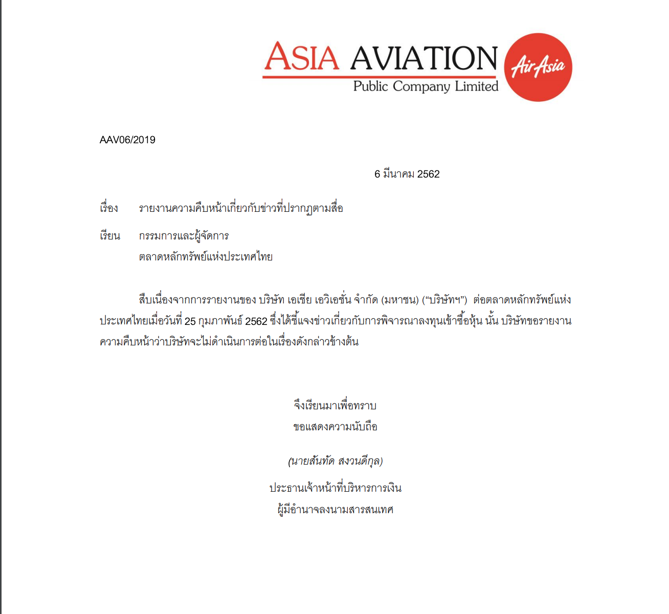 หลังจากวันที่ 25 กุมภาพันธ์ที่ผ่านมาทางฝั่งของ “ไทย แอร์เอเชีย” (AAV) ได้ประกาศว่ากำลังอยู่ในระหว่างการศึกษาและดำเนินการซื้อหุ้นจาก สายการบินนกแอร์ (NOK) แต่เมื่อเวลาผ่านไป วันนี้(6 มีนาคม) ทางไทย แอร์เอเชีย ได้ประกาศยุติการดำเนินการดังกล่าวแล้ว