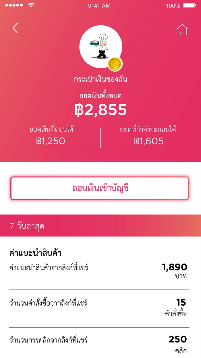 สำหรับค่าตอบแทนที่ได้จากการแชร์ สามารถตรวจสอบได้ที่ Wallet ของแต่ละคน จำนวนเงินในด้าน Pending คือ ค่าตอบแทนที่เพื่อนของคุณซื้อสินค้าจากลิงก์ของคุณ และหาก 7 วันหลังจากเพื่อนได้รับสินค้าและไม่ทำการคืนสินค้าที่ซื้อ ค่าตอบแทนจะย้ายมาด้าน Available ซึ่งสามารถถอนเงินได้จากหน้า Wallet ทันที เพียงแค่คุณยืนยันตัวตนผ่านขั้นตอนง่ายๆ ในระบบ ด้วยการระบุ เบอร์โทรศัพท์ เลขบัตรประชาชน และบัญชีธนาคาร เงินจะเข้าบัญชีตามที่ได้ระบุไว้