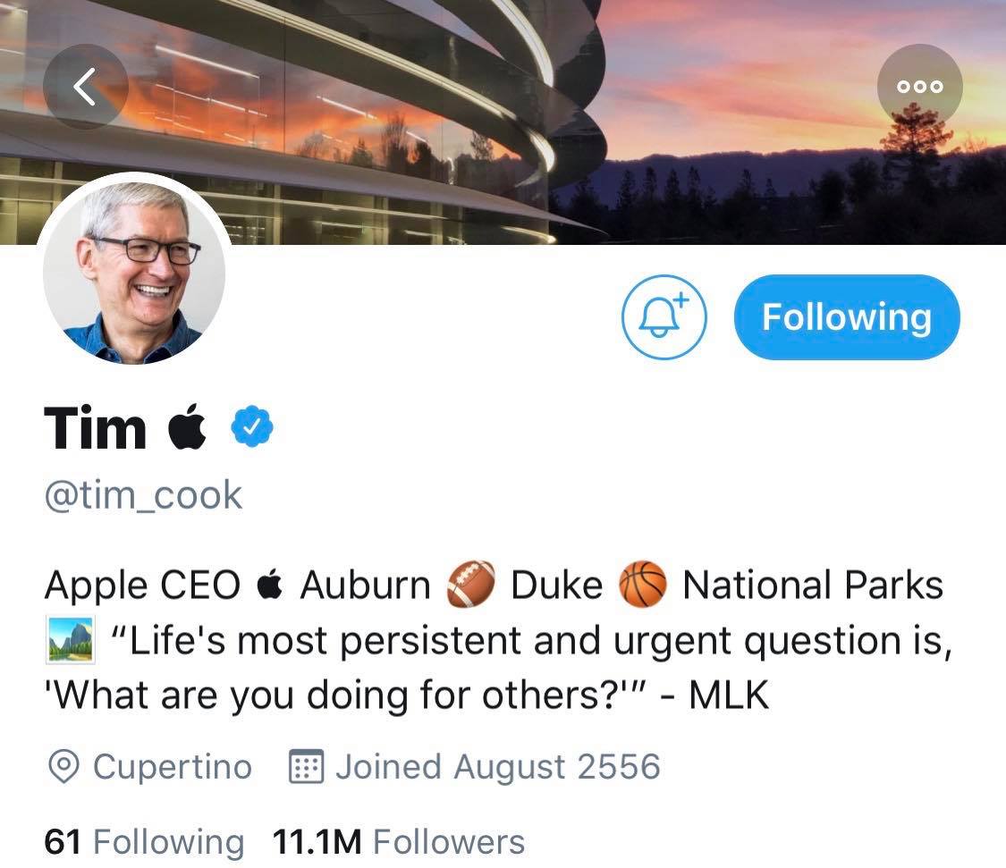 ล่าสุด Tim Cook ได้เปลี่ยนชื่อโปรไฟล์ของตัวเองในทวิตเตอร์เป็น Tim แล้วตามด้วยไอค่อน Apple โลโก้ของบริษัทแล้ว Tim