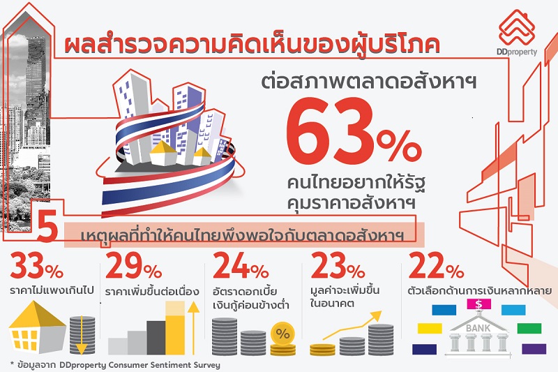 DDproperty เว็บไซต์สื่อกลางซื้อ-ขายอสังหาริมทรัพย์อันดับ 1 ของไทย เปิดเผยผลการสำรวจความคิดเห็นของผู้บริโภคต่อสภาพตลาดอสังหาริมทรัพย์ (DDproperty Consumer Sentiment Survey) รอบล่าสุดพบว่าผู้บริโภคชาวไทยยังมีทัศนคติที่ดีต่อตลาดที่อยู่อาศัยอย่างต่อเนื่องตั้งแต่ครึ่งหลังของปี 2559 เป็นต้นมา ซึ่งเป็นผลจากการเพิ่มขึ้นของความสามารถในการซื้อความพึงพอใจต่อสถานการณ์ตลาดอสังหาริมทรัพย์และปัจจัยเสริมต่าง ๆทั้งด้านอุปทานที่เติบโตและมีคุณภาพดีขึ้น ประกอบกับการขยายเส้นทางขนส่งมวลชนระบบรางที่ใกล้ความเป็นจริงของทั้งระบบโดยหนึ่งในสามของผู้ตอบแบบสำรวจระบุว่ามีแผนจะซื้อที่อยู่อาศัยภายใน 6 เดือน