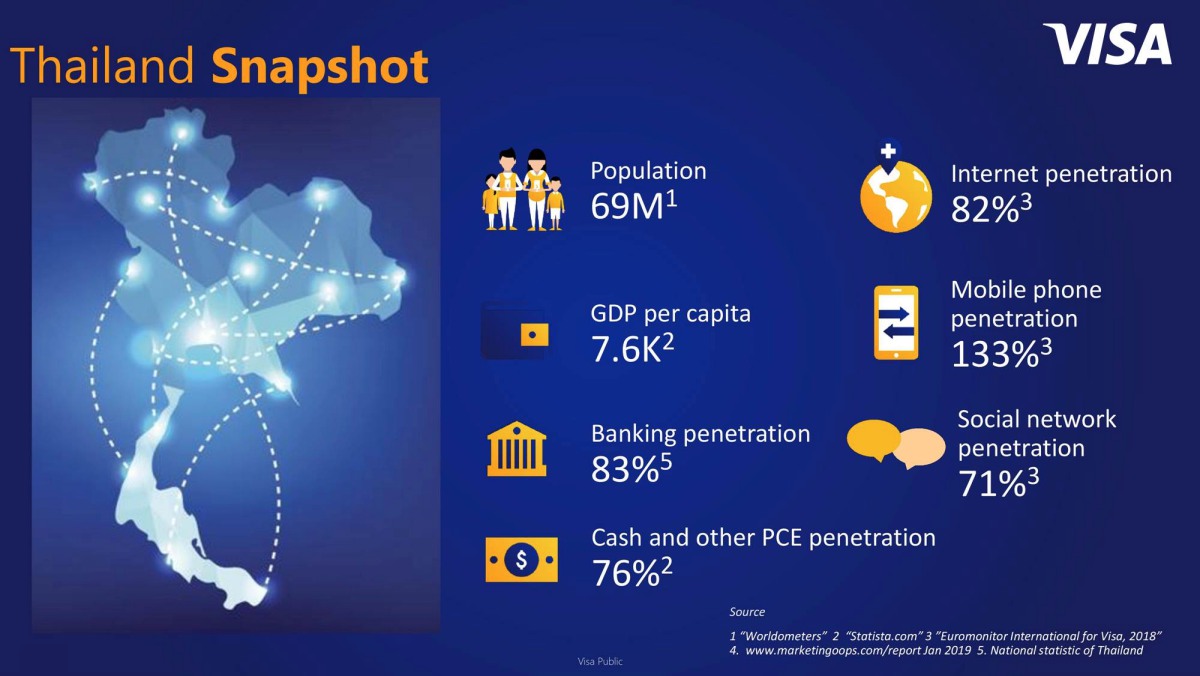 คุณสุริพงษ์ ตันติยานนท์ ผู้จัดการวีซ่า ประจำประเทศไทย ให้ข้อมูลเพิ่มเติมว่า เมื่อพิจารณาปัจจัยพื้นฐานต่างๆ ของประเทศไทยจะพบว่า อยู่ในสภาพท่ีเอื้อต่อการเติบโตของธุรกิจ e-Payment ไม่ว่าจะเป็นจำนวนประชากรที่ขยายตัวจนเกือบแตะ 70 ล้านคน การเข้าถึงอินเตอร์เน็ตของประชากรในสัดส่วน 82% การถือครองสมาร์ทโฟน 133% นั่นหมายความว่าโดยเฉลี่ยแล้วคนไทยแต่ละคนมีมือถือกันมากกว่าคนละเครื่อง รวมทั้ง 71% ที่มีการใช้งานโซเชียลเน็ตเวิร์ก และอัตราการถือครองสมุดบัญชีเงินฝากอยู่ท่ี 83% เป็นต้น