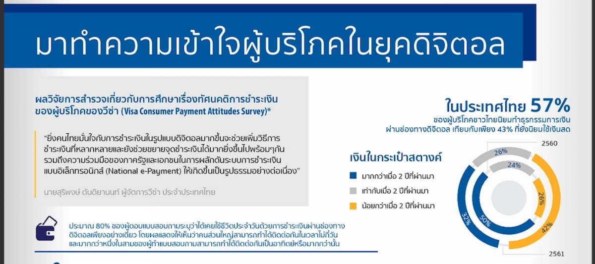 ความเชื่อนี้สะท้อนผ่านผลจากการสำรวจเกี่ยวกับการศึกษาเรื่องทัศนคติการชำระเงินของผู้บริโภคประจำปี 2561 ของวีซ่า (Visa Consumer Payment Attitudes Survey 2018) ซึ่งทำการศึกษาต่อเนื่องมากว่า 5 ปีแล้ว เพื่อทำความเข้าใจถึงทัศนคติและพฤติกรรมเกี่ยวกับการชำระเงินผ่านระบบอิเล็กทรอนิกส์ และเป็นการเฝ้ามองแนวโน้มรวมทั้งความเปลี่ยนแปลงในระยะยาวมากกว่าแค่การเก็บข้อมูลในช่วงเวลาหนึ่งๆ เท่านั้น
