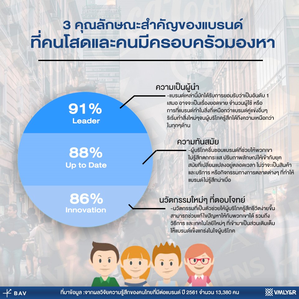 จากผลสำรวจทางทีมงานพบว่า…ทั้งคนโสดและคนมีครอบครัวยังมองหาแบรนด์ที่มีทั้ง 3 คุณลักษณะนี้เป็นสิ่งแรกเสมอ คือ ความเป็นผู้นำตลาด ความทันสมัย และการพัฒนานวัตกรรมใหม่ๆ ที่ตอบโจทย์ลูกค้า