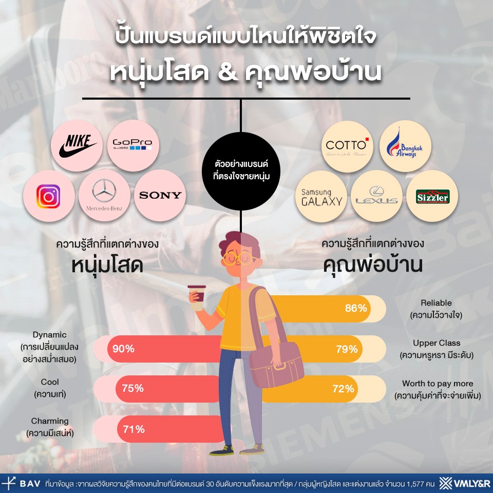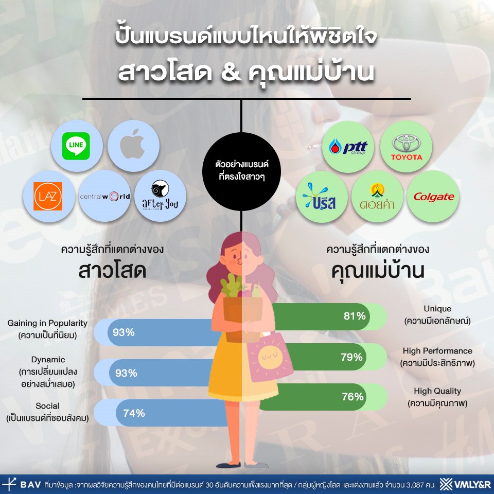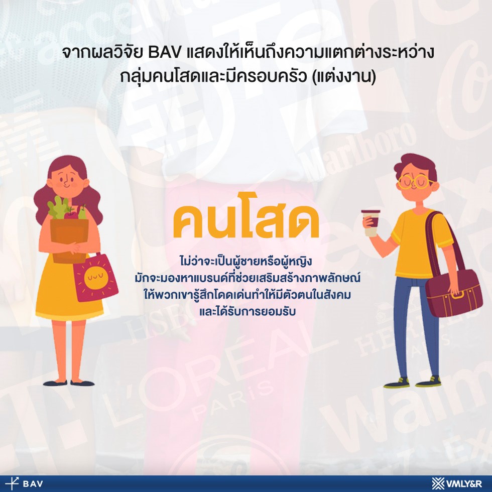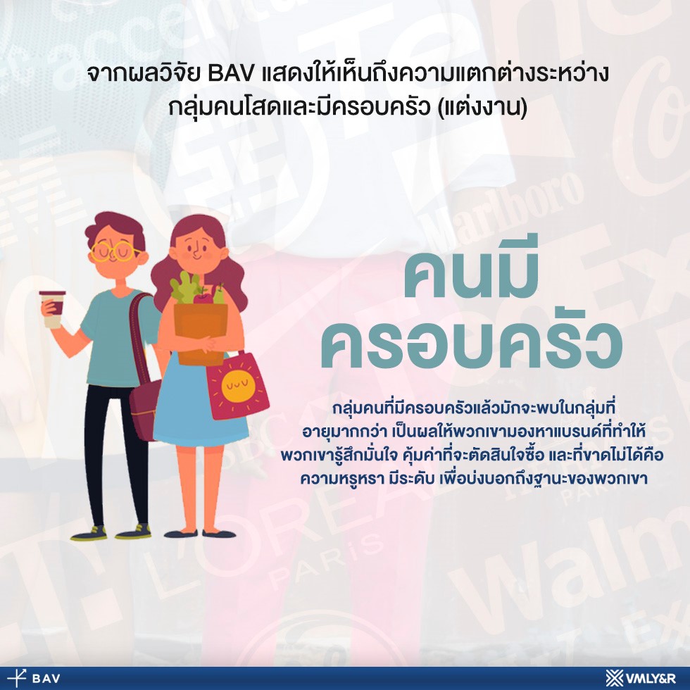 นอกเหนือจากสามสิ่งที่แบรนด์ในยุคนี้ต้องมีแล้ว แบรนด์แบบไหนที่คนโสดมักชื่นชอบ และแบรนด์แบบไหนที่คนมีครอบครัวมีแนวโน้มชื่นชอบ เครื่องมือ BAV ของ VMLY&R จะช่วยตอบคำถามนี้ให้ชัดเจนมากยิ่งขึ้น มากกว่านั้นเรายังใช้เพศเป็นอีกปัจจัย ที่จะช่วยบ่งชี้ความแตกต่างในมุมมองที่มีต่อแบรนด์นั้นๆ