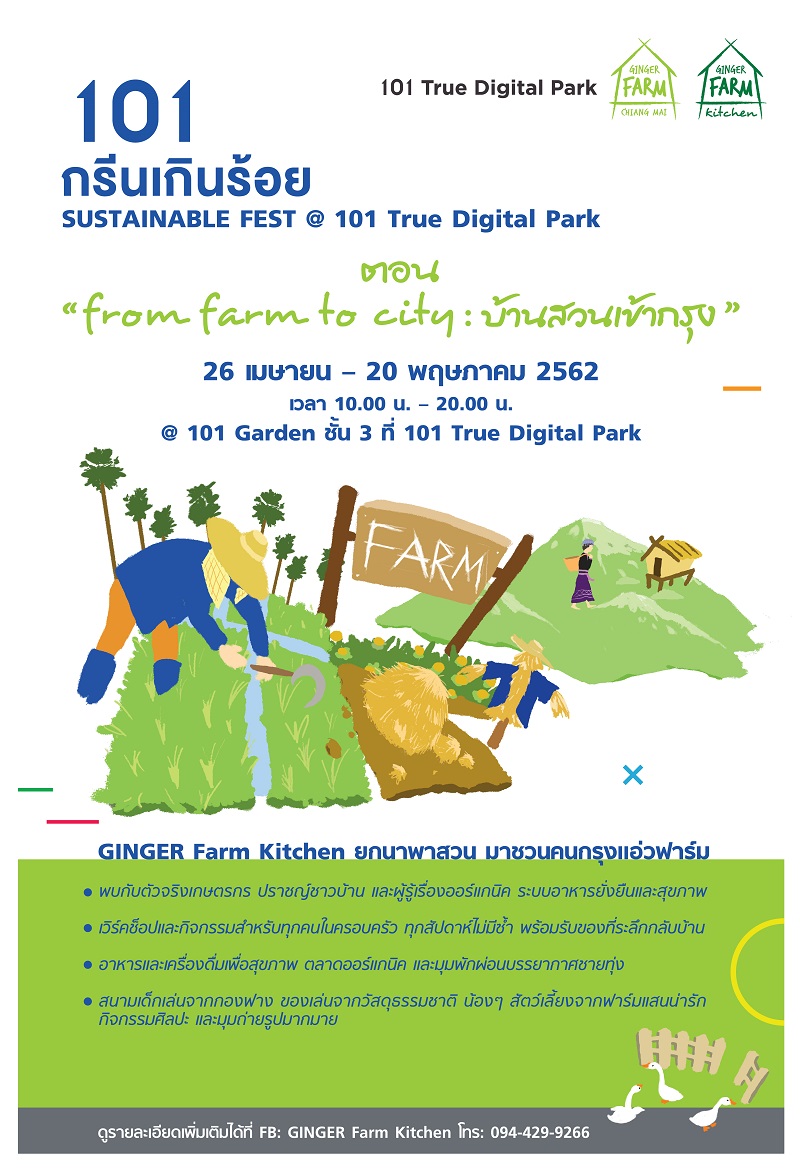 ชวนคลายร้อนกับกิจกรรมสายกรีนใน “เทศกาล 101 กรีนเกินร้อย” 101 True Digital Park ร่วมกับ Ginger Farm Kitchen นำเสนอแหล่งเรียนรู้วิถีธรรมชาติแบบไทยๆ แห่งใหม่ในกรุงเทพฯ “From Farm to City: บ้านสวนเข้ากรุง” โดยยกฟาร์มสดๆ จากเชียงใหม่มาให้คนกรุงได้สัมผัส พร้อมกิจกรรมครบจบที่เดียว จากปราชญ์ชาวบ้าน เกษตรกร และ ผู้เชี่ยวชาญด้านธุรกิจออร์แกนิค มาให้ความรู้เกี่ยวกับระบบอาหารยั่งยืนเพื่อสุขภาพ นอกจากนี้ยังมีเวิร์คช้อปเกี่ยวกับอาหารและสุขภาพจากวิทยากรผู้เชี่ยวชาญ และ เจ้าของแบรนด์ธุรกิจผลิตภัณฑ์ออร์แกนิคชื่อดังมาให้ความรู้ และ ประสบการณ์จริงในโลกธุรกิจสายกรีน ผ่านกิจกรรมเวิร์คช็อป การสาธิตวิธีการทำผลิตภัณฑ์ออร์แกนิคอย่างใกล้ชิด อาทิ อ.วลัยลักษณ์ อินชัย สอนทำลูกประคบออร์แกนิค และตอกเส้นแก้ปวดเมื่อยบรรเทาอาการออฟฟิศซินโดรม พบกับ อรุษ นวราช แห่งสามพรานโมเดลเกษตรอินทรีย์ ในหัวข้อระบบอาหารยั่งยืน พบกับ อโณทัย กุณาคำ ในหัวข้อ การกินอาหารเพื่อสุขภาพจากสมุนไพรพื้นบ้าน ต้านโรค ภูมิปัญญาท้องถิ่น และ Ginger Farm สอนทำกระถางแก้มลิงจากขวดรีไซเคิล
