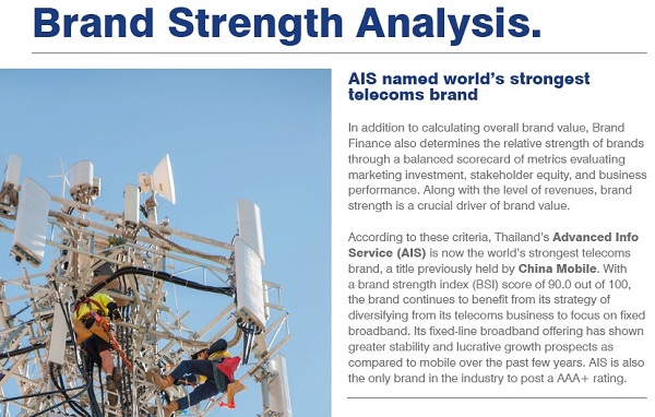 - ที่สำคัญคือ สามารถขยายธุรกิจจาก Mobile ไปสู่ Fixed Broadband ซึ่งถือเป็นธุรกิจใหม่และสร้างการเติบโตได้อย่างโดดเด่นในช่วง 2-3 ปีที่ผ่านมา ด้วยปัจจัยดังกล่าว ทำให้ภาพรวมมูลค่าแบรนด์ของ AIS มีความแข็งแกร่งเป็นอันดับ 1 จากการศึกษาข้อมูลเชิงลึกจากบริษัทในกลุ่มโทรคมนาคมทั่วโลก 300 บริษัท เฉือนชนะ China Mobile ซึ่งเคยได้อันดับ 1ในปีที่ผ่านมา