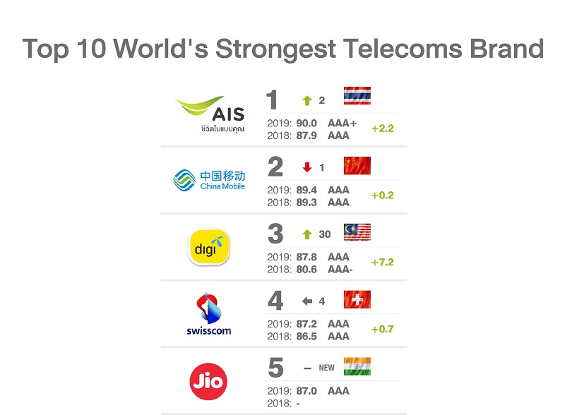 AIS ได้รับการจัดอันดับเป็น “แบรนด์โทรคมนาคมที่แข็งแกร่งที่สุดในโลก อันดับ 1 – World’s Strongest Telecoms Brand” จากผลสำรวจและจัดอันดับแบรนด์ที่แข็งแกร่งที่สุด ประจำปี 2019 โดย Brand Finance องค์กรที่ปรึกษาด้านกลยุทธ์และคุณค่าของแบรนด์ที่มีชื่อเสียงระดับโลก ซึ่งประเมินจากความแข็งแกร่งทางการเงิน การลงทุน การดูแลผลประโยชน์ของผู้มีส่วนได้ส่วนเสียอย่างครบถ้วน พร้อมขีดความสามารถในการขยายตัวสู่ธุรกิจใหม่ได้อย่างโดดเด่น ถือเป็นแบรนด์ไทย 1 เดียวใน 10 อันดับแรก ที่เฉือนชนะแชมป์เก่าอย่าง China Mobile ยืน 1 ในฐานะตัวแทนประเทศไทยอย่างเต็มภาคภูมิ
