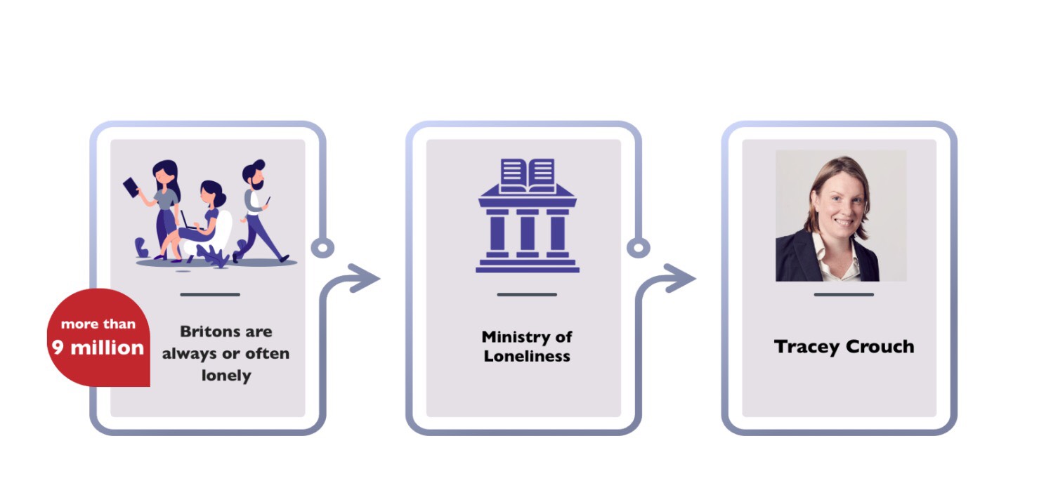 ประเทศอังกฤษ เป็นหนึ่งตัวอย่างของประเทศที่จริงจังต่อการจัดการเรื่องของความเหงาให้ประชาชนในชาติ จากตัวเลขประชากรคนเหงาในอังกฤษที่มีสูงถึง 9 ล้านคน โดยในจำนวนนี้มีถึง 2 แสนคน ที่เป็นผู้สูงอายุและไม่ได้พบปะพูดคุยกับเพื่อนหรือคนรู้จักมาไม่ต่ำกว่า 1 เดือน และเมื่อเจาะลึกลงไป พบว่ากลุ่มผู้สูงอายุราวๆ 2 ล้านคนทั่วเกาะอังกฤษ ที่ต้องอาศัยอยู่ตามลำพัง รวมทั้งแนวโน้มประชากรที่ต้องใช้ชีวิตอยู่เพียงลำพังเพิ่มสูงมากขึ้น ทำให้ทางรัฐบาลโดย เทเรซ่า เมย์ นายกรัฐมนตรีหญิงแห่งอังกฤษ มีมติให้จัดตั้งกระทรวงความเหงาขึ้นมาเพื่อดูแลจัดการด้านความเหงาให้กับคนในชาติ พร้อมแต่งตั้ง เทรซีย์ เคร้าช์ รัฐมนตรีว่าการกระทรวงกีฬาทำหน้าที่ดูแลกระทรวงแห่งความเหงานี้ควบคู่กันไปด้วย