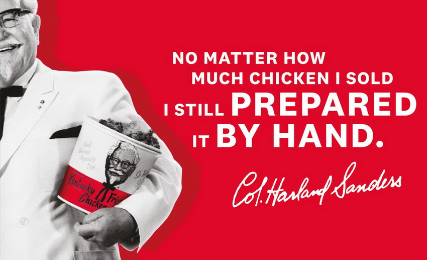 ผู้พันแซนเดอร์ส คือต้นแบบของผู้เริ่มต้นทำธุรกิจด้วยความรักอย่างแท้จริง เขารักในการทำอาหาร ทุ่มเทตั้งใจคิดค้นสูตรไก่ทอดที่อร่อยที่สุด และตั้งใจสร้างให้กลายเป็นธุรกิจ ถึงแม้จะพบกับอุปสรรคความล้มเหลวหลายต่อหลายครั้ง แต่ยังคงแน่วแน่กับสิ่งที่รัก พยามยามอย่างเต็มที่ในการพัฒนาต่อ ยึดมั่นกับมาตรฐาน จนกลายเป็นธุรกิจที่ประสบความสำเร็จ ได้รับความนิยมไปทั่วโลก จากวันนั้นถึงวันนี้ กว่า 70 ปี ที่มาตรฐานความอร่อยของผู้พันฯ ถูกส่งต่อกันมารุ่นสู่รุ่น ไม่เคยเปลี่ยนแปลง สิ่งนี้แหละที่ทำให้ไก่ทอดเคเอฟซีในวันนี้ ไม่สามารถมีไก่ทอดแบรนด์ไหนมาทดแทนได้