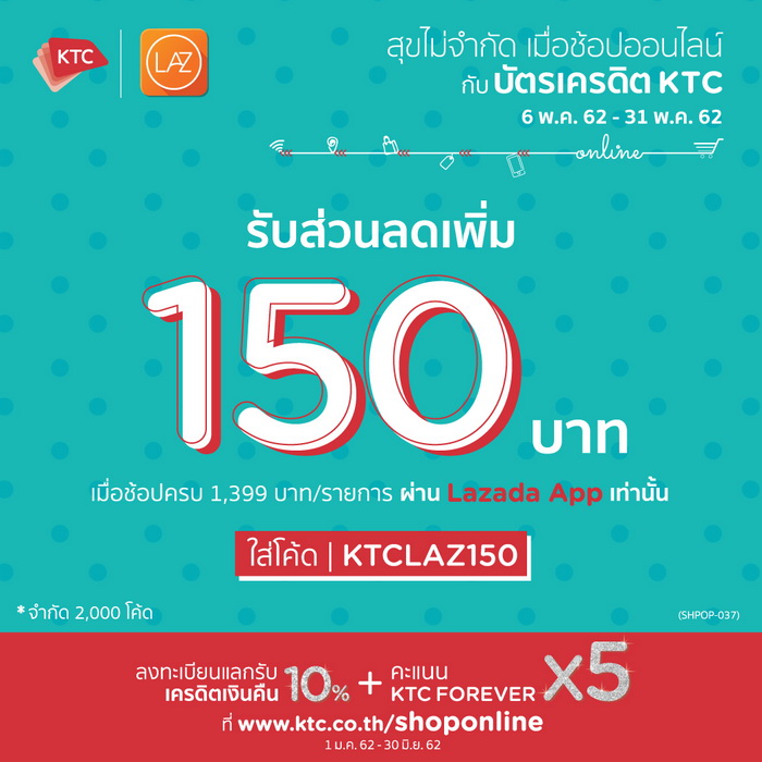 “เคทีซี” หรือ บริษัท บัตรกรุงไทย จำกัด (มหาชน) จัดแพ็ค 3 สิทธิพิเศษให้กับสมาชิกที่ซื้อสินค้าออนไลน์ผ่านแอปพลิเคชัน “Lazada” (1) รับทันทีส่วนลด 150 บาท เมื่อชำระค่าสินค้าด้วยบัตรเครดิตเคทีซีครบ 1,399 บาทต่อรายการ และระบุรหัสส่วนลด “KTCLAZ150” (จำกัด 2,000 โค้ดเท่านั้น) ระหว่างวันที่ 6 พฤษภาคม 2562 – 31 พฤษภาคม 2562 (2) แลกรับเครดิตเงินคืน 10% และ (3) รับคะแนน KTC FOREVER x5 (คะแนนปกติ 1 เท่า และคะแนนพิเศษ 4 เท่า) โดยสิทธิพิเศษที่ 2 และ 3 จะต้องใช้คะแนน KTC FOREVER เท่ากับยอดซื้อต่อรายการในการแลกรับ และลงทะเบียนผ่าน www.ktc.co.th/shoponline ระหว่างวันที่ 1 มกราคม 2562 – 30 มิถุนายน 2562