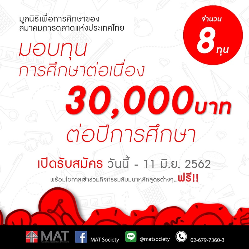 ทางมูลนิธิฯ จึงเปิดรับสมัคร นักศึกษาทุนต่อเนื่อง ประจำปี 2562 จำนวน 8 ทุน โดยจะให้การสนับสนุนการศึกษา จำนวน 30,000 บาท ต่อปี ต่อเนื่องจนจบการศึกษา (ภายใน 4 ปี) โดยไม่มีข้อผูกมัดในการใช้ทุนใดๆ พร้อมโอกาสให้ผู้รับทุนสามารถเข้าร่วมกิจกรรมสัมมนาหลักสูตรต่างๆกับสมาคมการตลาดแห่งประเทศไทย โดยไม่มีค่าใช้จ่ายตลอดโครงการ จึงนับเป็นโอกาสทางการศึกษาครั้งสำคัญ เพื่อนักศึกษาวิชาการตลาดที่มีความมุ่งมั่น พร้อมสร้างความเปลี่ยนแปลง