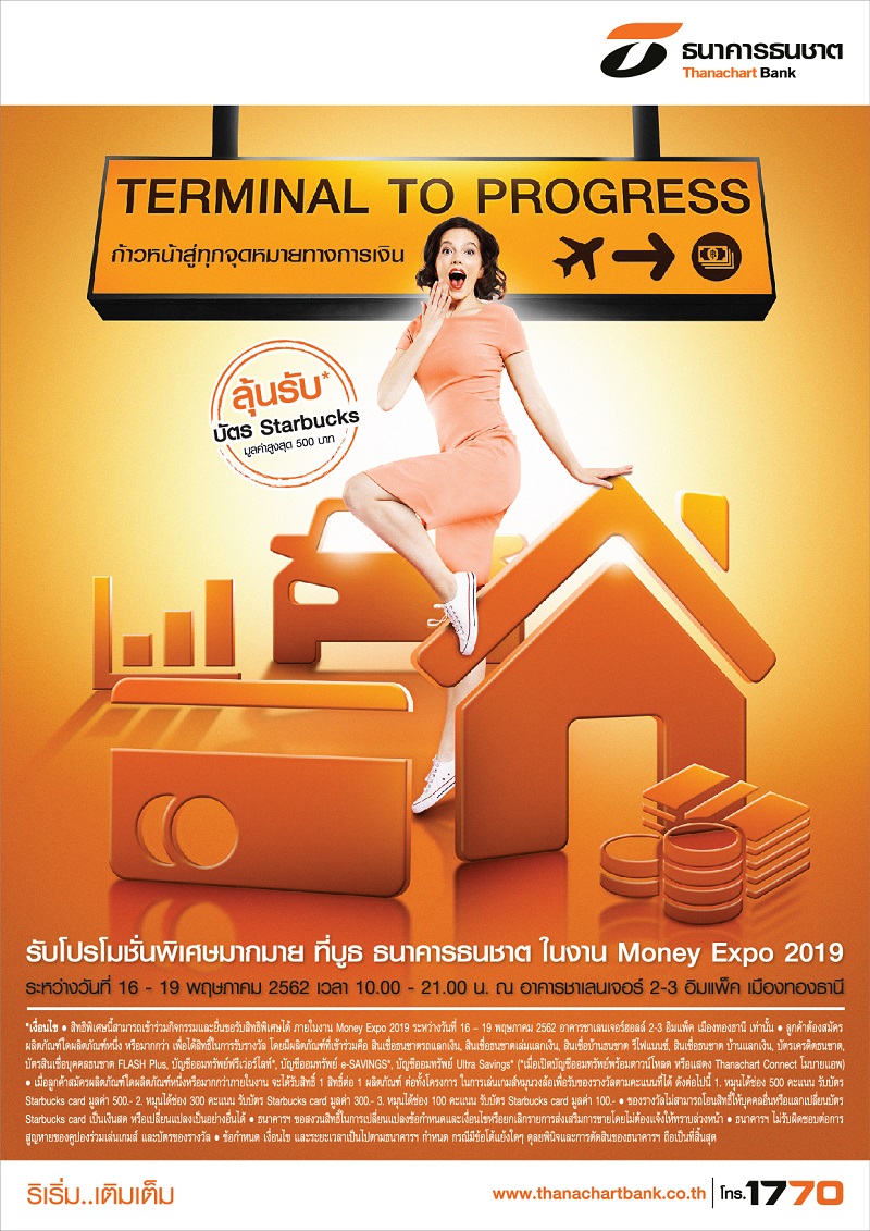 ธนชาต บุกงาน “มันนี่ เอ็กซ์โป 2019” ชูคอนเซ็ปต์เทอร์มินอลสู่ความก้าวหน้า “Terminal to Progress” ยกทัพผลิตภัณฑ์และโปรโมชั่นพิเศษ พร้อมขับเคลื่อนความก้าวหน้าให้ลูกค้ามุ่งสู่ทุกจุดหมายทางการเงิน ชวนออมทรัพย์รับดอกเบี้ยสูง 1.6% ต่อปีกับบัญชี Ultra Savings ขอสินเชื่อบ้าน รีไฟแนนซ์ รับดอกเบี้ยพิเศษ! 3.29% เฉลี่ย 3 ปี ฟรีจดจำนอง-ประเมินหลักประกัน สมัครสินเชื่อรถแลกเงิน-เล่มแลกเงินในงาน รู้ผลอนุมัติเร็วใน 30 นาที สินเชื่อบุคคลธนชาต FLASH Plus ให้ดอกเบี้ยพิเศษ 0% นาน 3 รอบบัญชี เมื่อสมัครใช้บริการโอนเงินผ่อนสบาย (Sabai Cash) พร้อมเล่นเกมในบูทธนชาต ลุ้นบัตร Starbucks มูลค่าสูงสุด 500 บาท