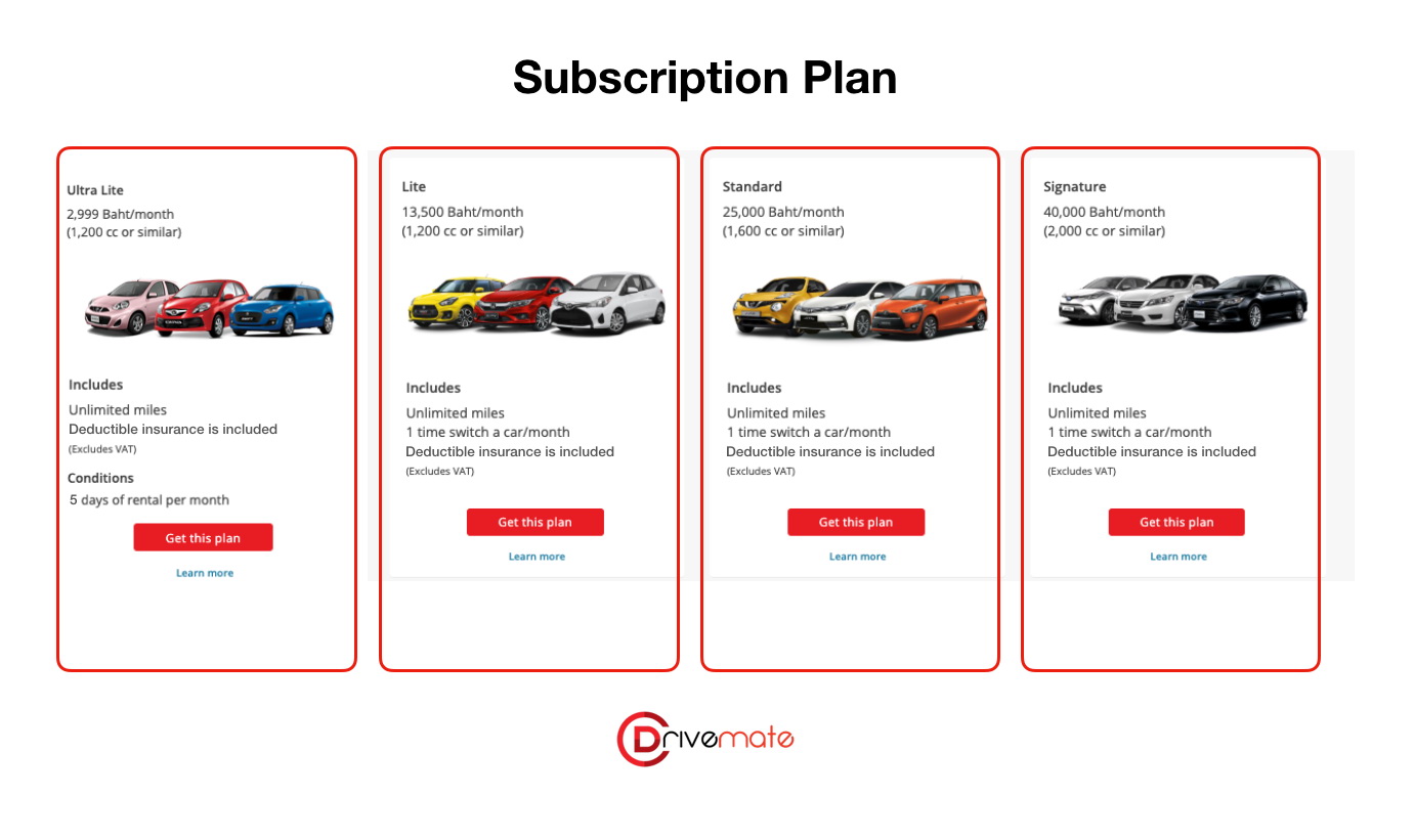 - Ultra Lite 2,999 บาท/เดือน (รถยนต์ 1,200 CC หรือเทียบเท่า) สามารถใช้รถได้ 5 วัน/เดือน ต้องจองล่วงหน้าอย่างน้อย 24 ชม. ชำระเงินผ่านบัตรเครดิตเท่านั้น
