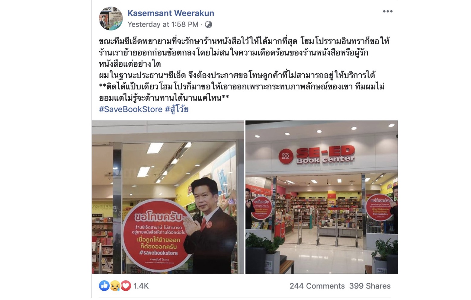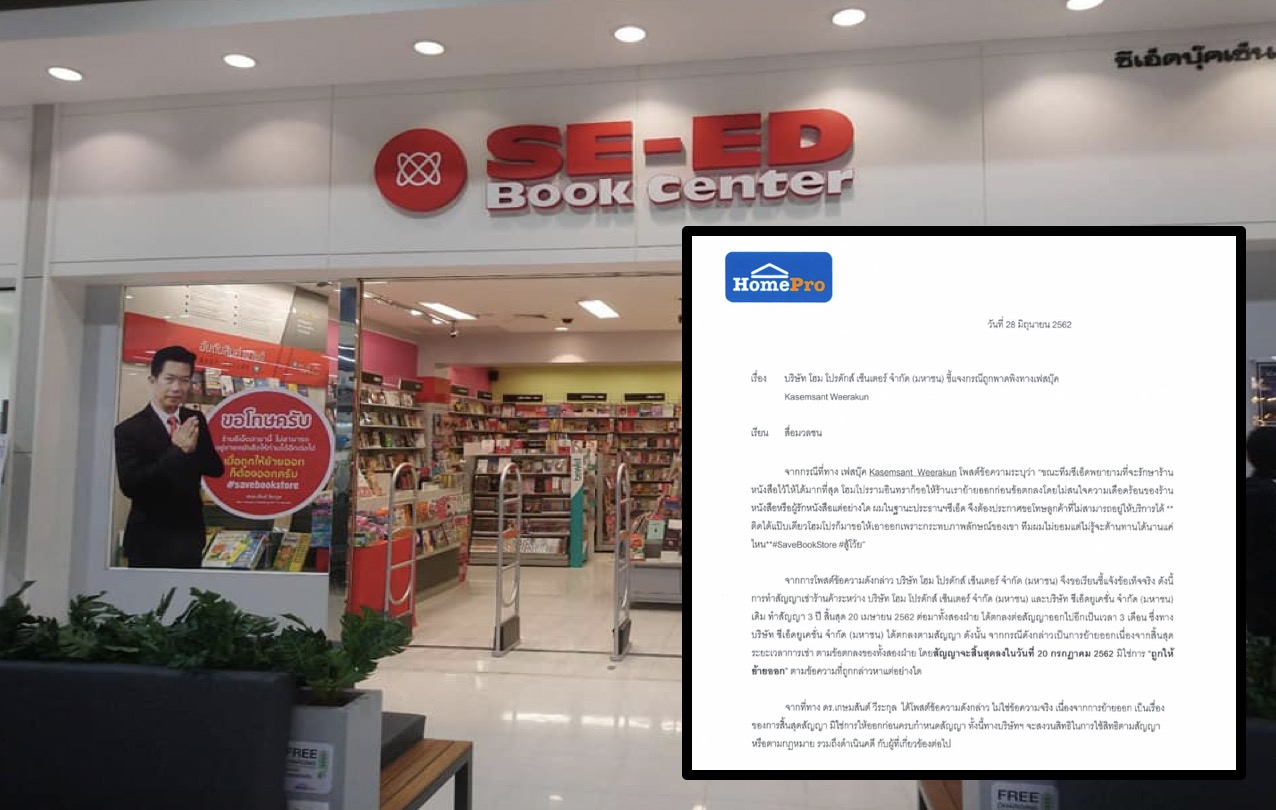 จากกรณีที่ทาง เฟสบุ๊ค Kasemsant Weerakun “โพสต์ข้อความระบุว่า ขณะทีมซีเอ็ดพยายามที่จะรักษาร้านหนังสือไว้ให้ได้มากที่สุด โฮมโปรรามอินทราก็ขอให้ร้านเราย้ายออกก่อนข้อตกลงโดยไม่สนใจความเดือดร้อนของร้านหนังสือหรือผู้รักหนังสือแต่อย่างใด ผมในฐานะประธานฯซีเอ็ด จึงต้องประกาศขอโทษลูกค้าที่ไม่สามารถอยู่ให้บริการได้ **ติดได้แป๊บเดียวโฮมโปรก็มาขอให้เอาออกเพราะกระทบภาพลักษณ์ของเขา ทีมผมไม่ยอมแต่ไม่รู้จะต้านทานได้นานแค่ไหน** #SaveBookStore #สู้โว้ย”