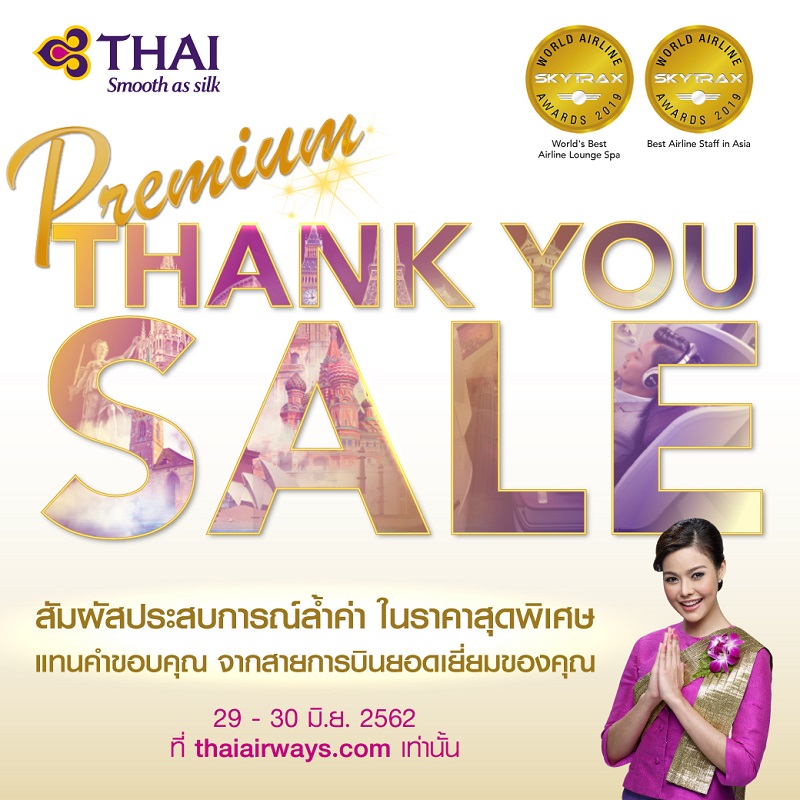 โอกาสนี้ การบินไทย ได้จัดโปรโมชั่น “Thank You Sale for Premium” แทนคำขอบคุณลูกค้าทุกท่าน อีกครั้งด้วยการ มอบส่วนลด 20% ราคาบัตรโดยสารชั้นเฟิร์สคลาส และชั้นธุรกิจ ทุกเส้นทางทั่วโลก โดยสามารถจองบัตรโดยสาร ผ่านเว็บไซต์ Thaiairways.com ระหว่างวันเสาร์ 29 มิ.ย.และวันอาทิตย์ 30 มิ.ย. 62 2 วันเท่านั้น สำหรับการเดินทางออกจากประเทศไทย ตั้งแต่วันที่ 29 มิ.ย. – 31 ก.ค.62 และวันที่ 20 ส.ค. – 30 ก.ย.62 ติดตามข้อมูลเพิ่มเติมและจอง เพียงคลิก http://bit.ly/2Lm4jFj